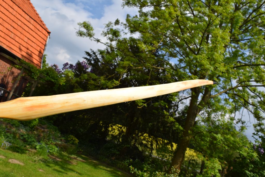 Ich habe in dem Stave keinen guten Bogen gesehen, extem dünne Ringe, sneaky und Drehwuchs - höchstens gutes Übungsmaterial um ein Gefühl für das Holz zu kriegen, bis meine besser geeigneten Eberesche-Staves soweit sind, dachte ich. Weit gefehlt - der Bogen macht anstandslos 52lbs mit und schiesst sich super - gefühlt sogar besser als meine Bögen aus Eibe, wobei ich da in dem Zuggewichtsbereich ja auch erst gerade beginne, das Potential von Eibe auszuschöpfen. Ebenfalls sehr gut gefällt mir die Kombination aus Kern und Splintholz, bei mir leider nur im Griffbereich vorhanden. Anfangs hatte ich noch schön lange Kernholzflammen im Wurfarm, die aber bei der Schwächung des Wurfarms bis auf einen kleinen Rest weichen mussten.