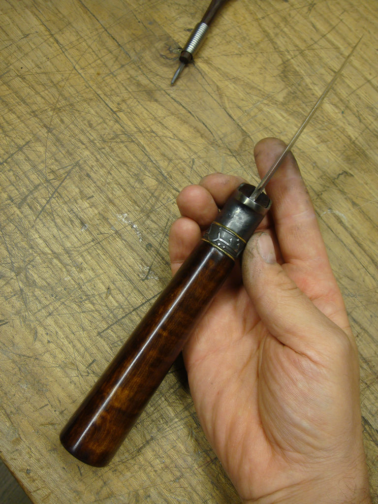 Griff ist Riegelahorn mit Leinöl-Shellac, so wie man auch z.B. Gewehrschäfte traditionell macht.