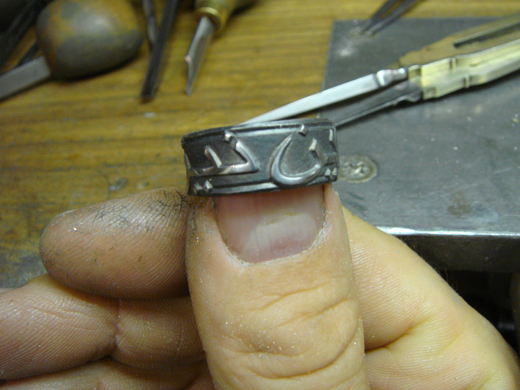 hier nochmal die Inschrift... einmal Rohform flach und dann in Stahl als Ring...