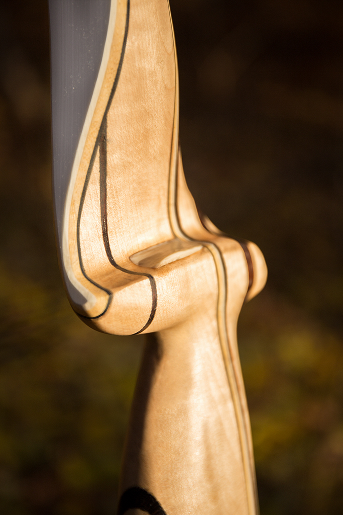 Den Bogen habe ich bewusst etwas asymetrisch gebaut. Der obere Wurfarm ist knappe 3 Zoll länger als der untere und hat auch ein leicht anderes Design.Das war eine Übung für ein Winterprojekt (laminierter Yumi) und ich muss sagen so schlecht geht das gar nicht! Der Bogen lässt sich sicher und weich bis 30 Zoll ziehen, Wirft unglaublich leise und angenehm schnell (209 fps mit 400 Grain Pfeil). Beim oberen Wurfarm habe ich an den Tips die Sehnenkerben weglassen müssen dafür hängt dort die Sehne quasi in nem Hacken.
