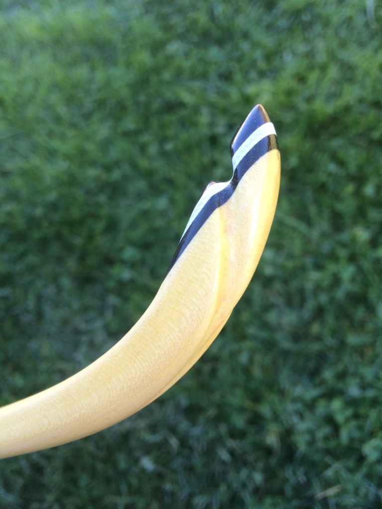 Der Bogen wurde, nachdem ich nur dran gebaut habe, wenn ich arbeitsmäßig auswärts unterwegs war, ausschließlich über die Schulter getillert. Dabei hab ich leider schon früh eine Schachstelle rein gekriegt, die sich leider nicht mehr ganz korrigieren ließ. Den Tillerbaum hat der Bogen nur für die Auszugsbilder gesehen.