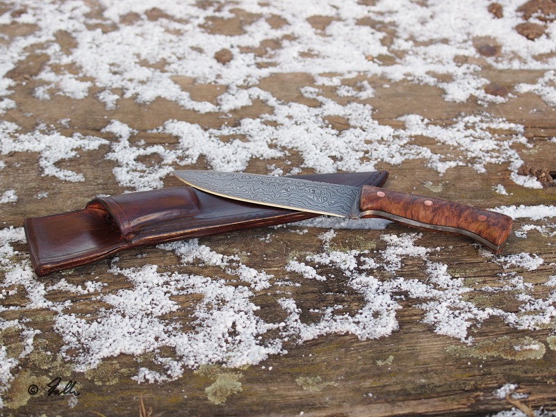 Damastblank ist von G. Breitenbücher, der Rest (Form, Anschliff, Ätzung (mit Eisendreichlorid) etc. von mir, gehärtet auf 60 HRC bei Schanz. Kupferpins, Goldfield und schwarze Liner, verklebt mit Epoxy und die Pins etwas angeklopft. Die Poren sind mit Schelleck nach und nach versiegelt, das Finish selbst ist meine Öl-Mischung.