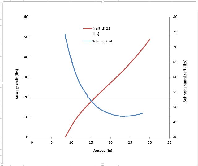 ich weiß nicht, ob ich diese Kurven schon einmal vorgestellt hatte. Bei diesem knapp 50lbs Langbogen hatte ich die Auszugskurve zusammen mit der Sehnenkraft gemessen.