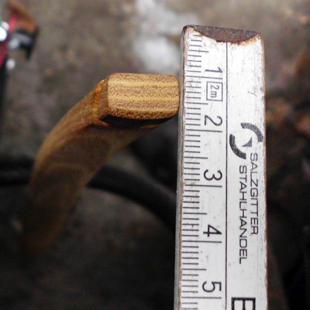 Bei dem Rohling hatte ich kaum Spielraum, zu den Tips hin war in der Dicke kaum noch ausreichend Holz da. Ich habe den Bauch quasi nur geglättet und war dann an den Tips auf gut 8,5 mm Dicke.