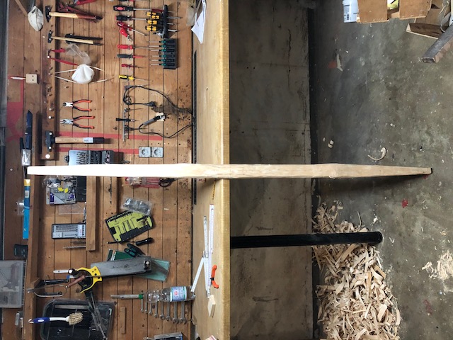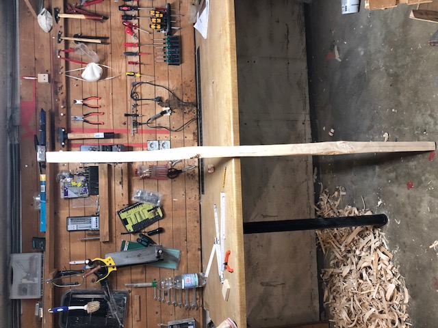 der Stave ist jetzt 180cm lang und 5cm breit (an den Enden schmälern sich die letzten 20cm auf 2cm Breite). (Fotos von der Seite und von oben.. leider findet meine Kamera das Neonlicht nicht so gut)