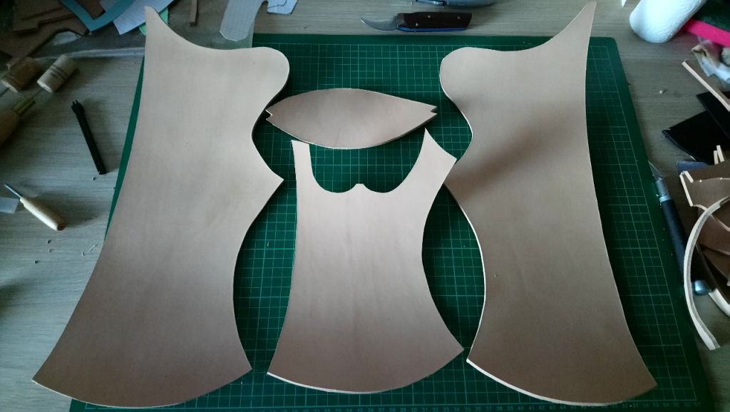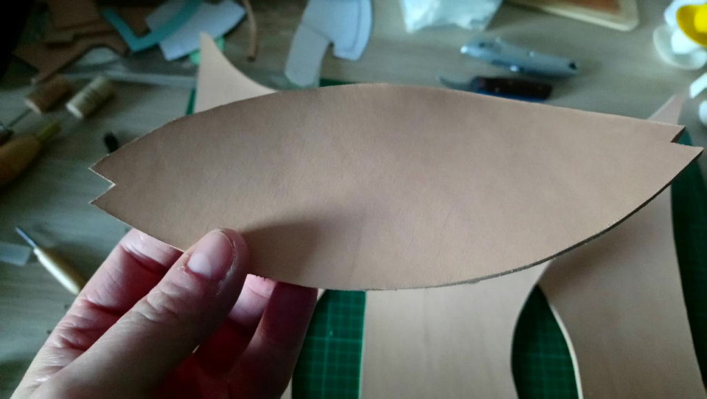 Dann wurde das Leder zugeschnitten und noch etwas aneinander angepasst. Das Unterteil habe ich erstmal so belassen. Bin noch nicht sicher ob ich es später linksrum oder rechtsrum einnähe. Laut Vorbild würde die Hautseite innen angenäht. Einfacher wäre es mit der Hautseite nach außen. Ich kann es leider nicht anders erklären. Hoffe die Bilder helfen etwas.
