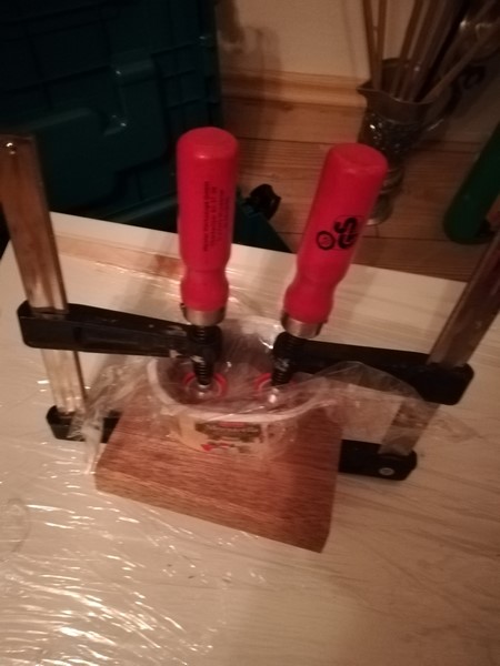 Da das Micarta lediglich für zwei WA-Tips benötigt wurde, habe ich die ganze Geschichte so einfach, wie möglich gehalten. Das Behältnis war vom Abendessen über, dazu zwei passende Brettchen in entsprechender Form aus Sperrholz und diese mit Backpapier umwickelt. Dazu Stoff von einem alten T-Shirt und bereits genanntes Epoxy System L. Den Rest sieht man auf den Bildern. Auf YT gibt es viele Filme mit verschiedenen Techniken. Ich würde auf jeden Fall mit einer geschlossenen Form arbeiten. Dann rutscht der Stapel nicht so leicht davon und die Sauerei mit dem Harz hält sich auch in Grenzen. Insgesamt ist die Micarta-Herstellung eigentlich ganz easy. Auf dem 2. Bild von unten sieht man eines der Brettchen.