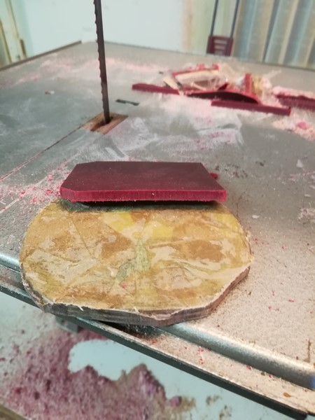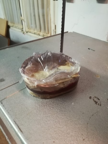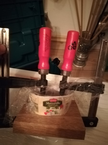 Da das Micarta lediglich für zwei WA-Tips benötigt wurde, habe ich die ganze Geschichte so einfach, wie möglich gehalten. Das Behältnis war vom Abendessen über, dazu zwei passende Brettchen in entsprechender Form aus Sperrholz und diese mit Backpapier umwickelt. Dazu Stoff von einem alten T-Shirt und bereits genanntes Epoxy System L. Den Rest sieht man auf den Bildern. Auf YT gibt es viele Filme mit verschiedenen Techniken. Ich würde auf jeden Fall mit einer geschlossenen Form arbeiten. Dann rutscht der Stapel nicht so leicht davon und die Sauerei mit dem Harz hält sich auch in Grenzen. Insgesamt ist die Micarta-Herstellung eigentlich ganz easy. Auf dem 2. Bild von unten sieht man eines der Brettchen.