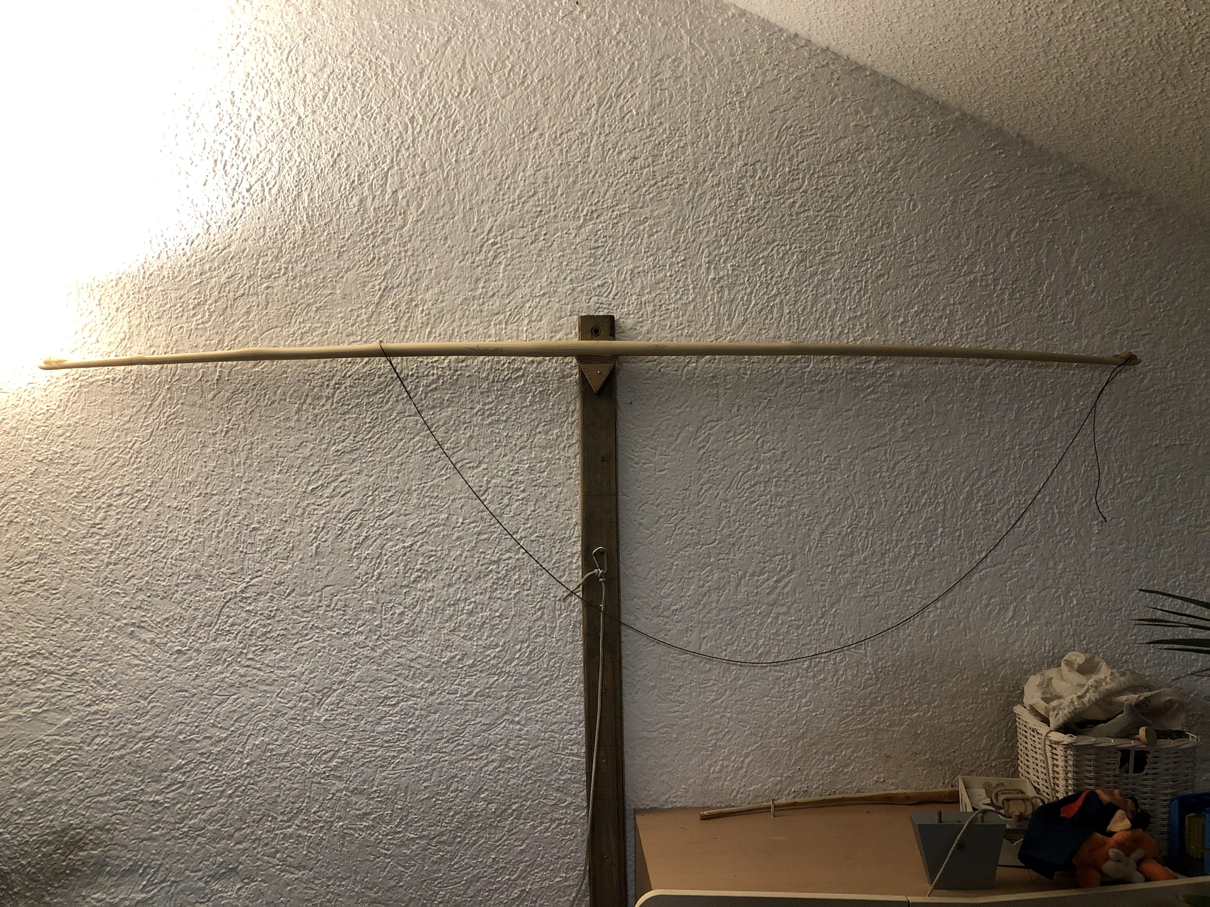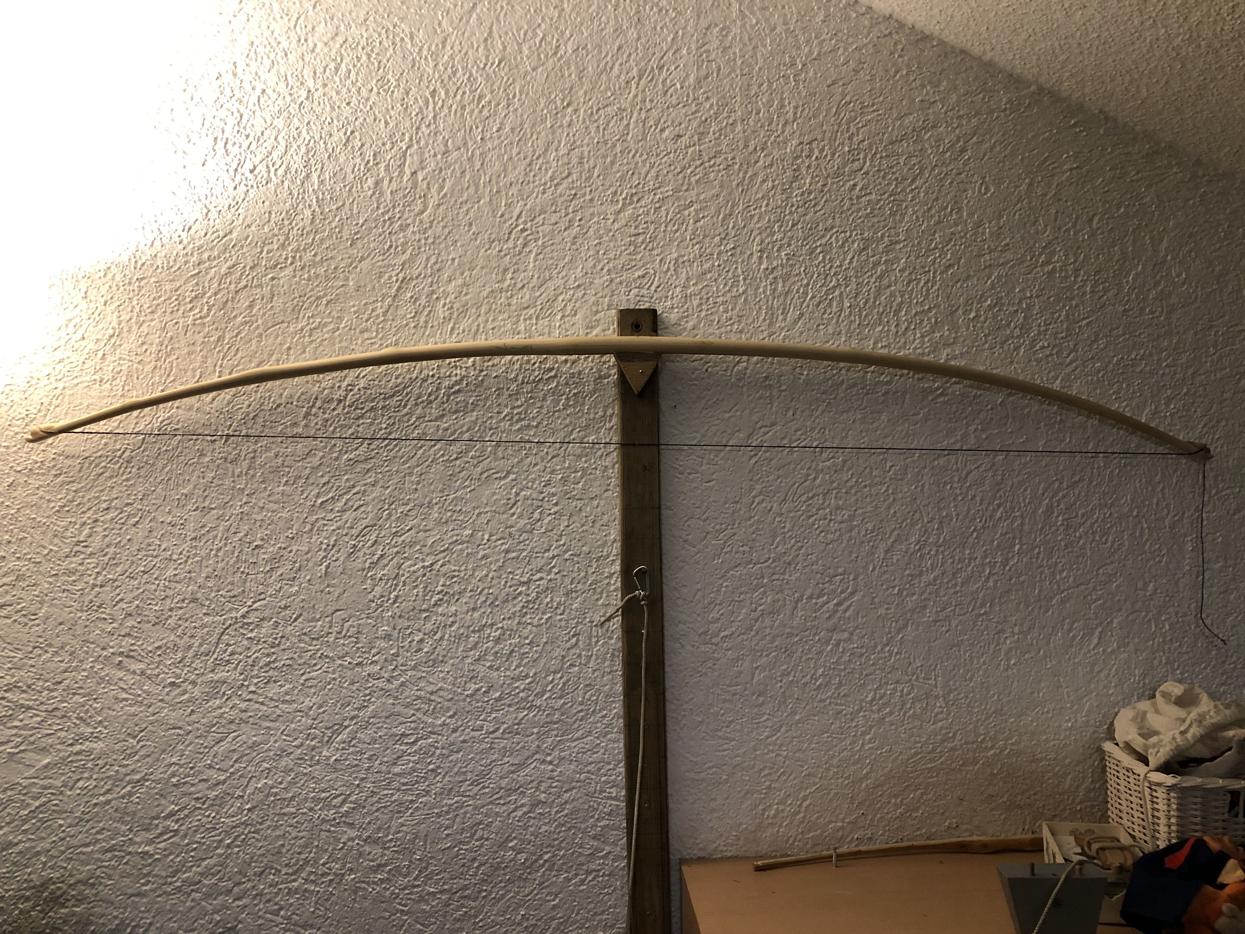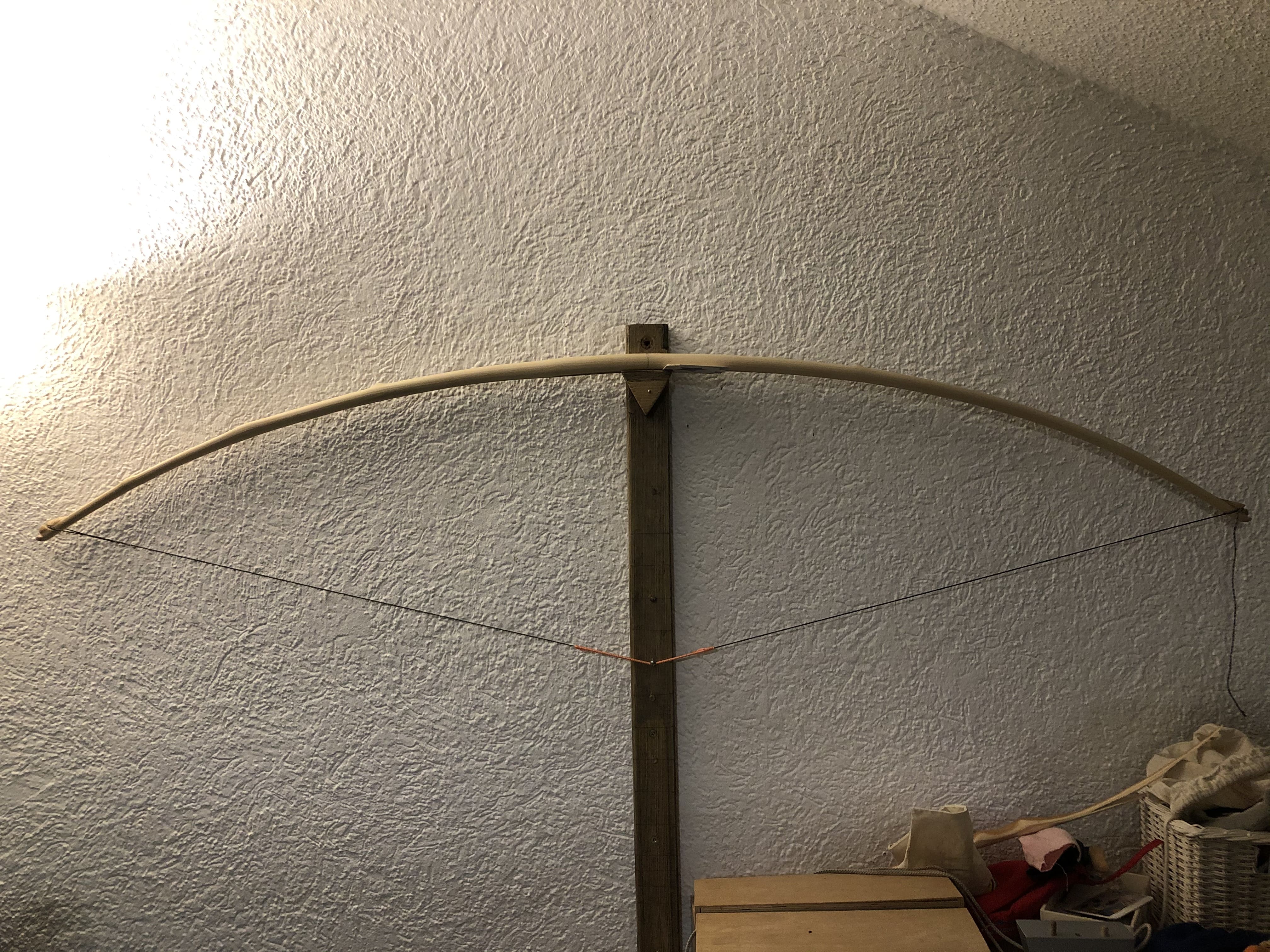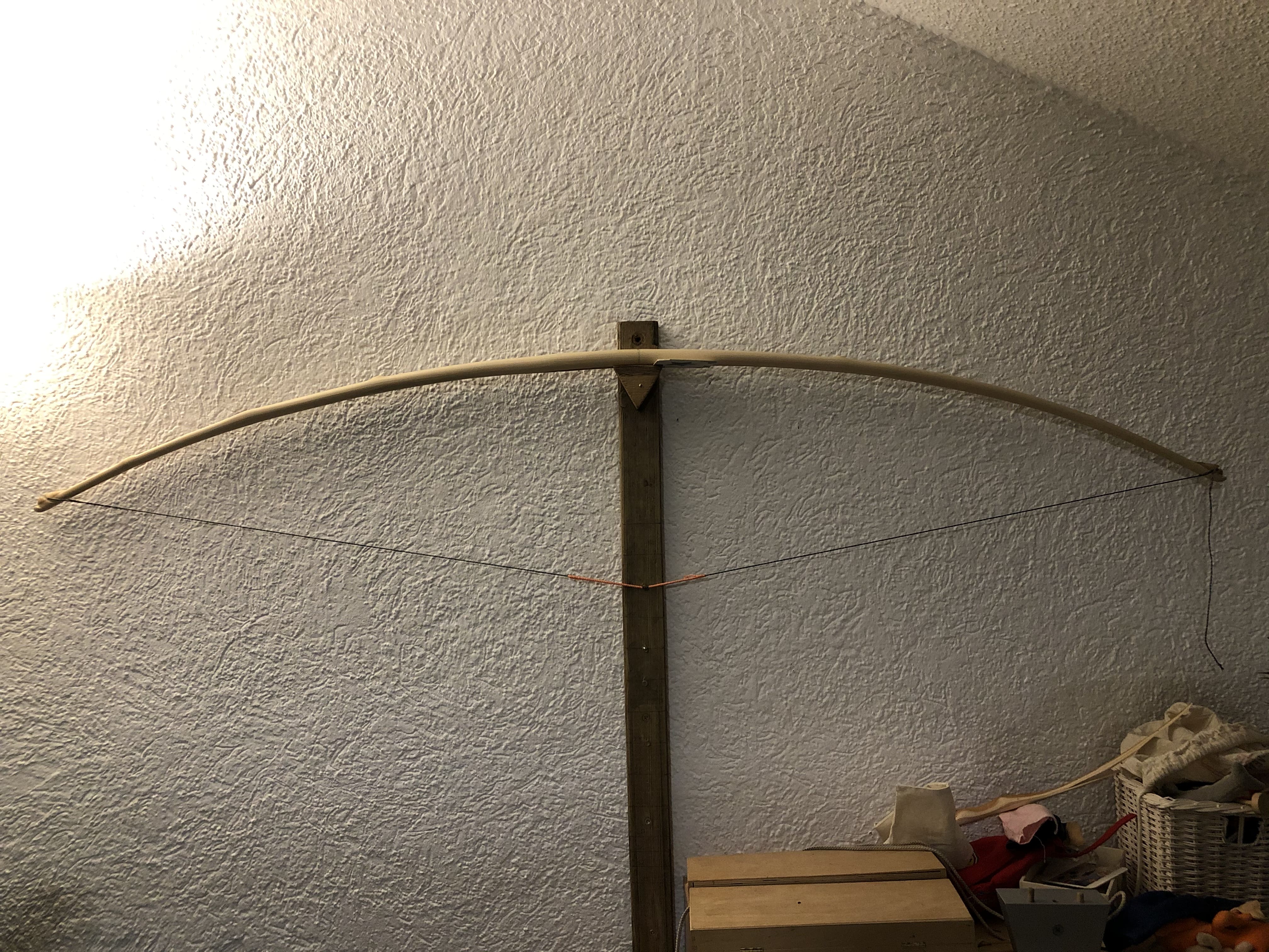 Der Bogen ist jetzt um fünf Zentimeter kürzer und gestern Nacht habe ich ihn endlich auf Standhöhe spannen können. Das hält er jedenfalls mal aus. An den Vollauszug werde ich mich mit Vorsicht herantasten, da sind ganz ordentliche Kräfte im Spiel.