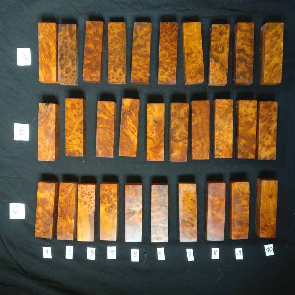 Mir ist glücklicherweise eine größerer Restbestand von wundervollem , spektakulärem Thujamaserholz(stammt aus Marokko) untergekommen, davon würde ich gerne einen Teil verkaufen.