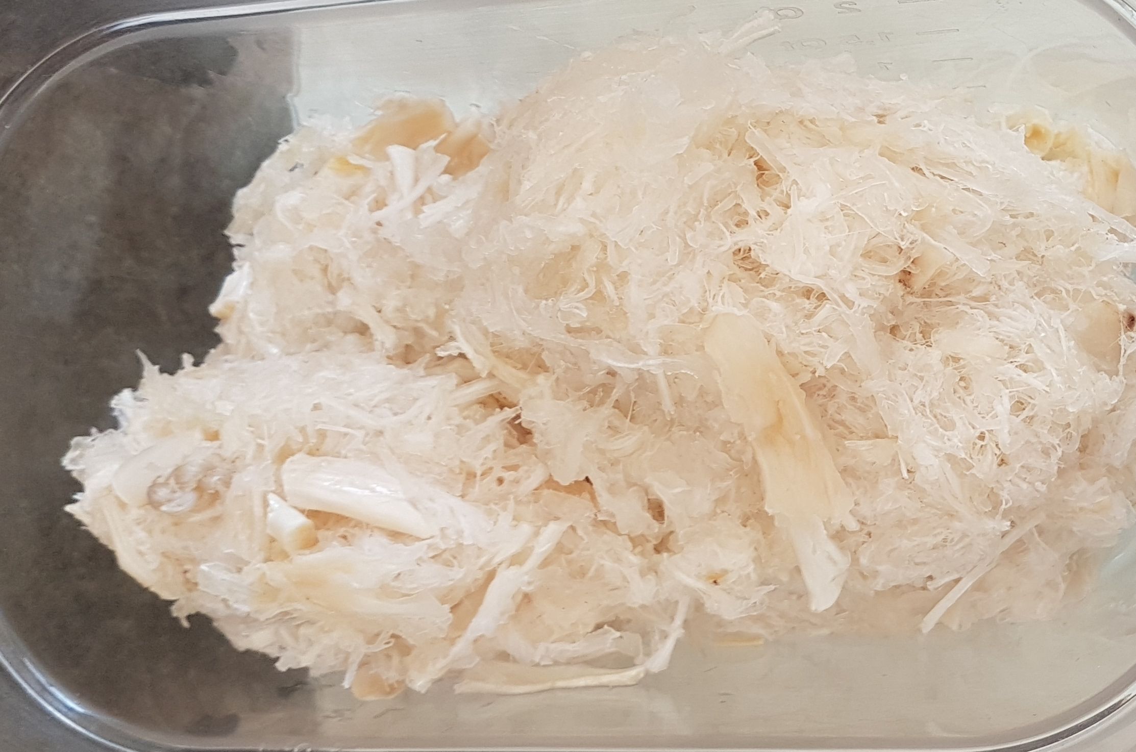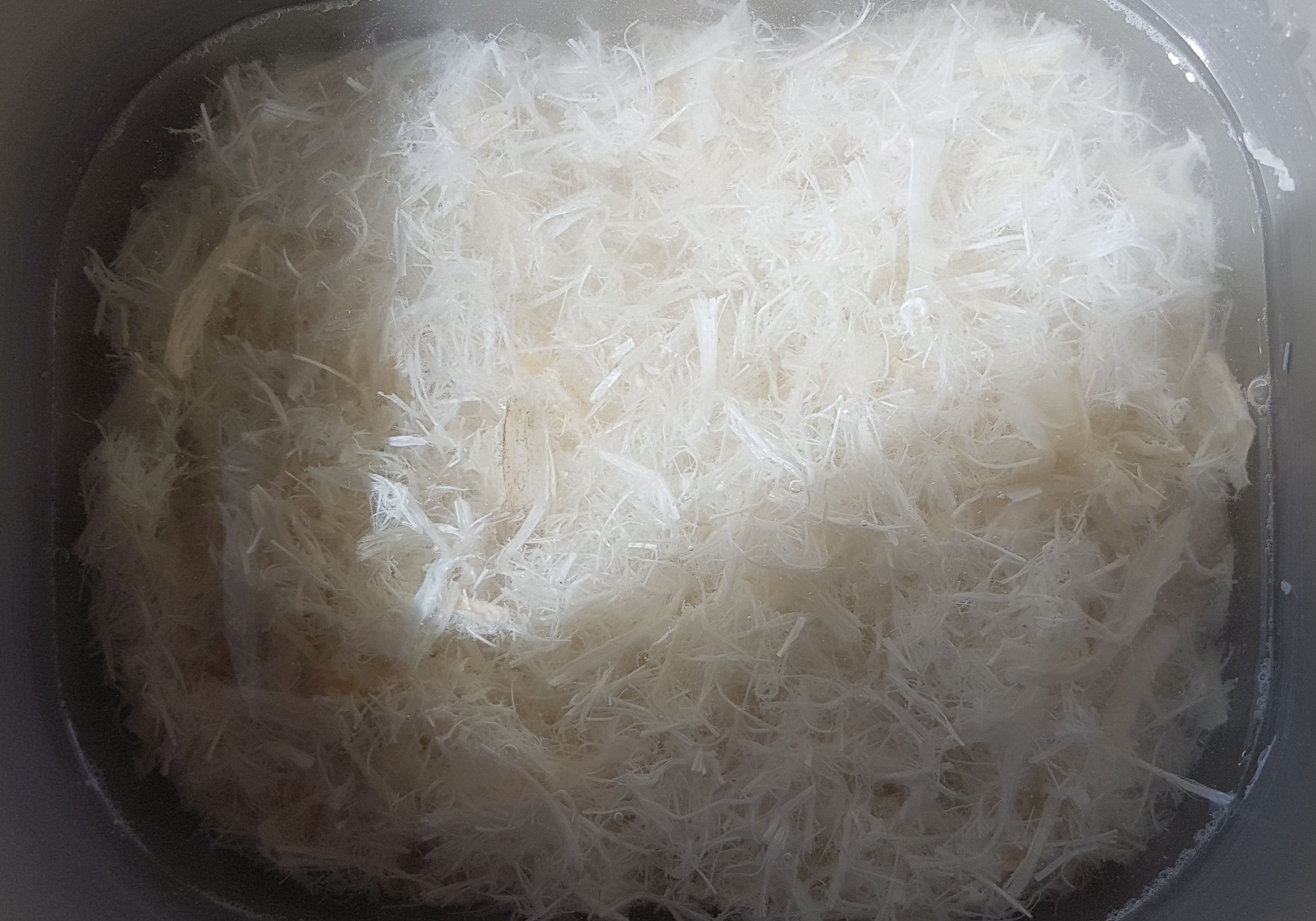 Sehnen gründlich waschen. Um evtl. verbliebenen Kalk zu neutralisieren, ins letzte Waschwasser etwas Salzsäure zugeben (im Beispiel ca. 2 cl, Konzentration 24%). Das Sehnenmaterial quillt nach der Zugabe stark auf - auf ausreichende Gefäß-Größe achten.