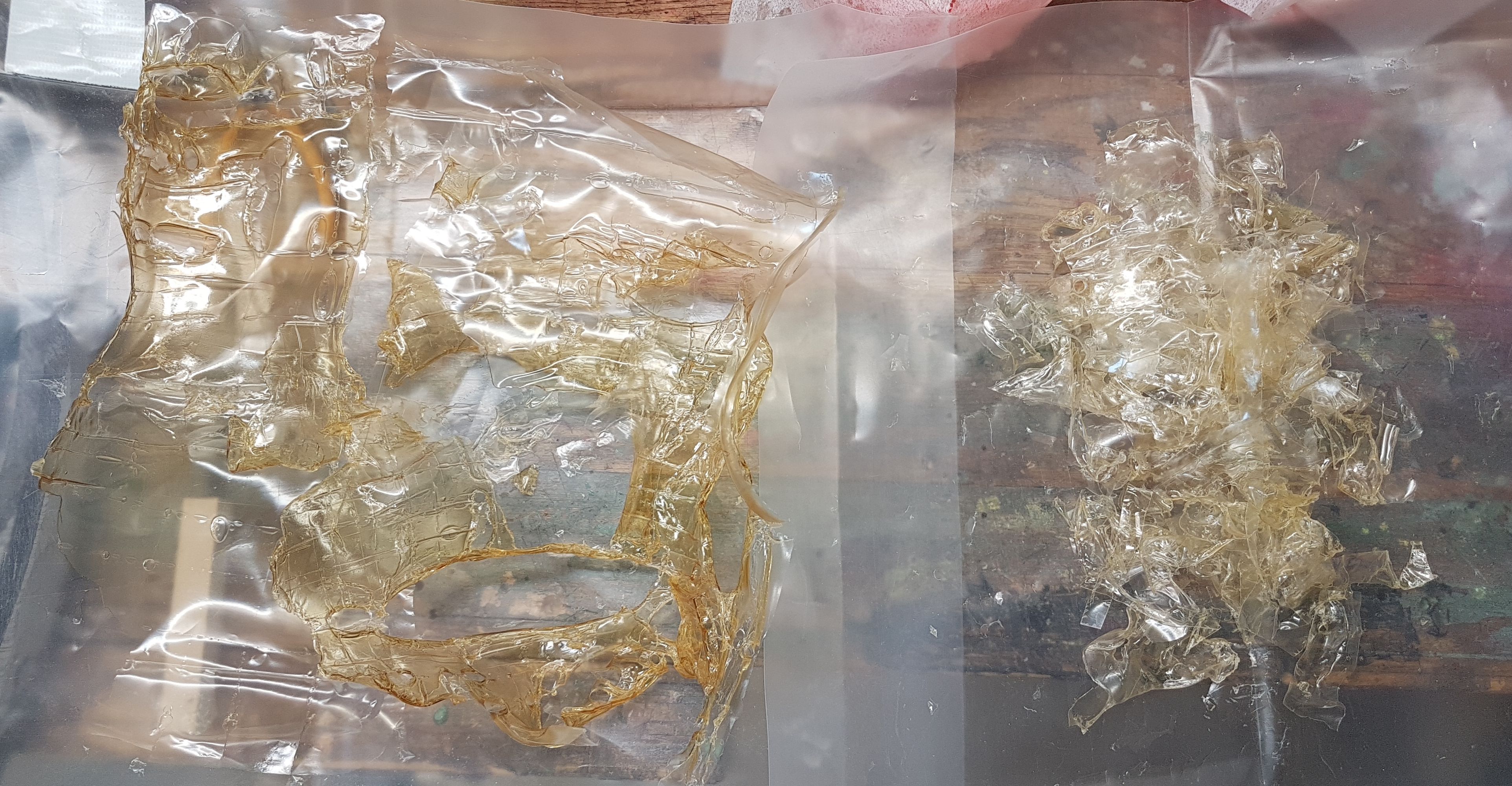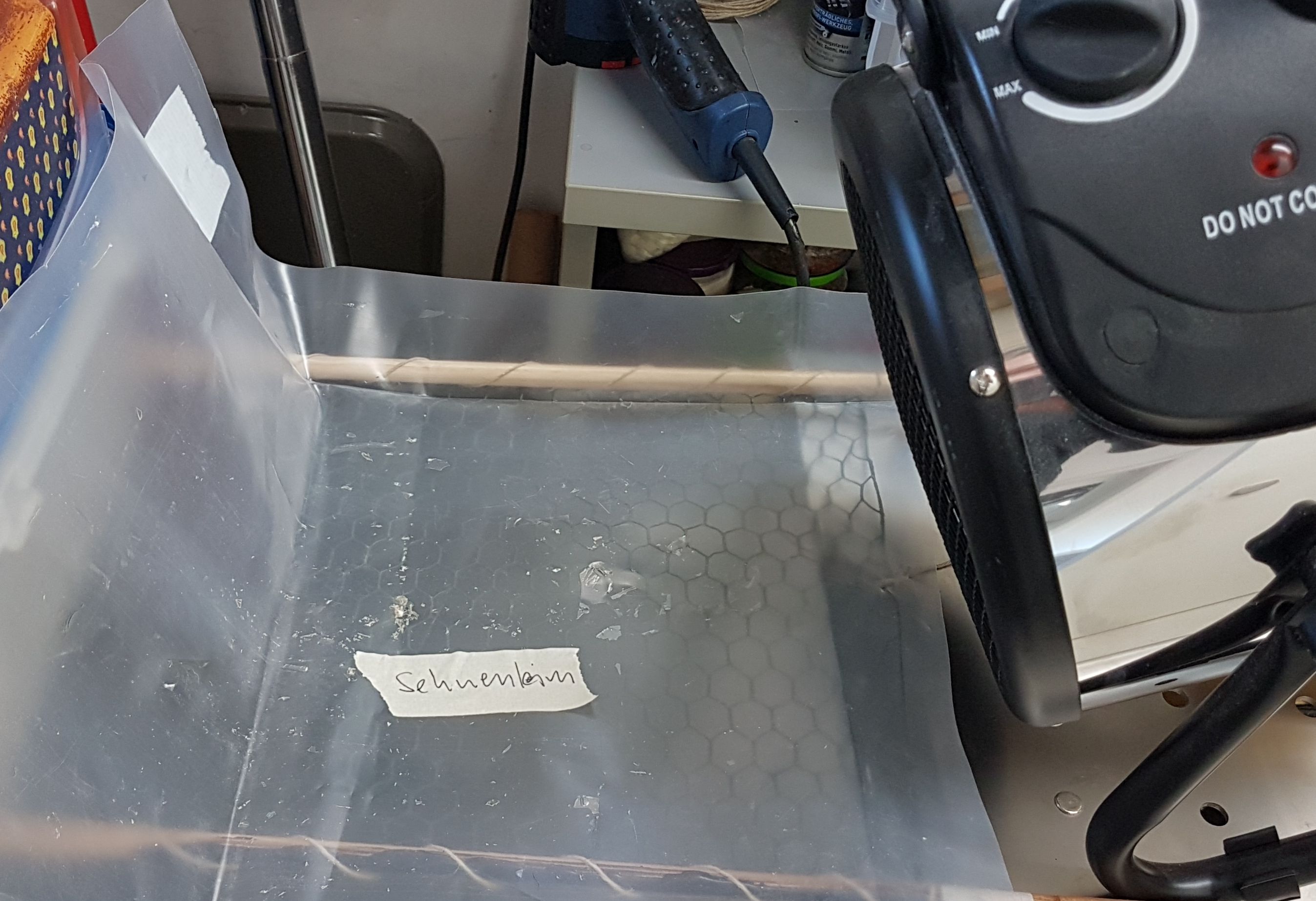 Trocknen der Leimlösung. Mit Hilfe eines Ventilators kann man den Vorgang deutlich beschleunigen. Das Gelee am besten in kleine Quadrate o.ä. ritzen um den Trocknungsvorgang nochmals zu beschleunigen.