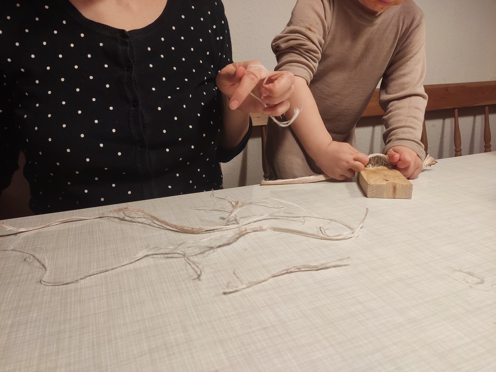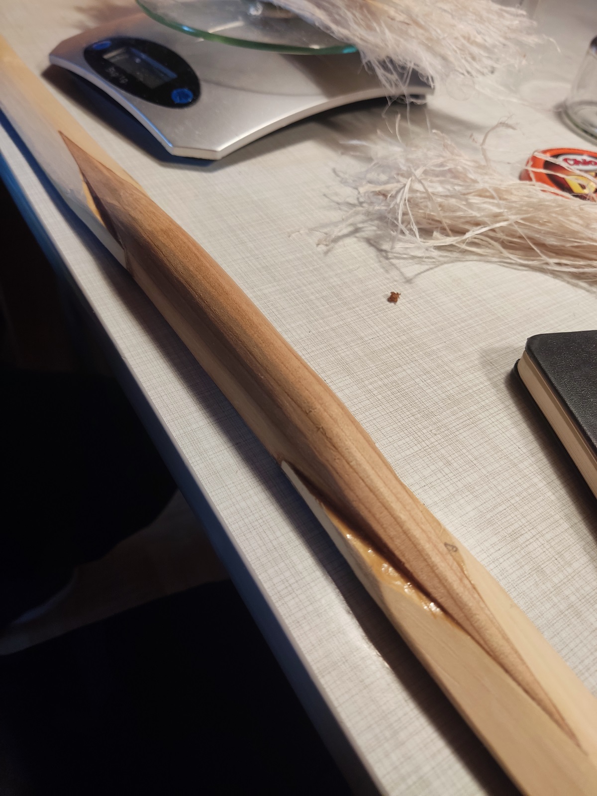Da der Bogen da zumindest optisch etwas mehr nach Bogen aussah war die Motivation wieder etwas größer und ich hab mir Hilfe beim Sehnen zerteilen geholt... Ein Spaß für die ganze Familie