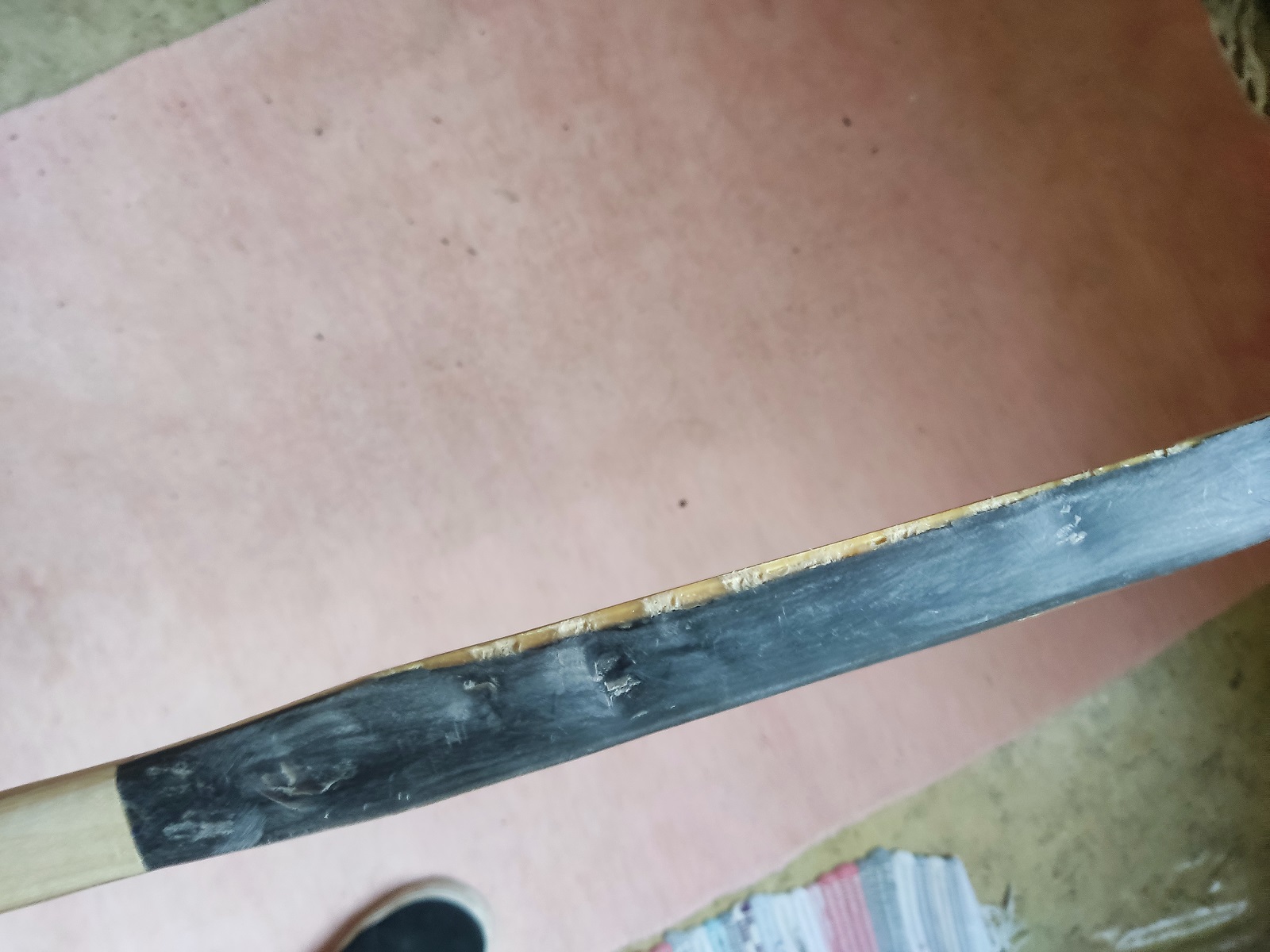 Im Bild zu sehen ist, dass das Horn am Rand ca 3mm schmaler ist als der Holzkern. Nicht so gut zu erkennen sind die Wellen die das Horn macht, wodurch das Horn stellenweise etwa 1mm dünner ist.