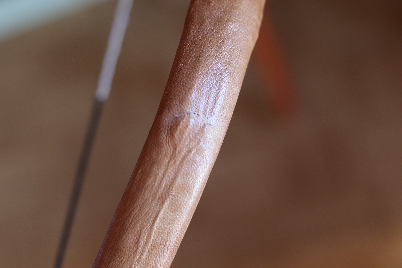 Beim ersten schießen hat dann allerdings der Sehnenbelag eine Schwachstelle gezeigt und sich ein 1cm breiter Streifen aufgerichtet und einen Riss ins Leder gemacht.