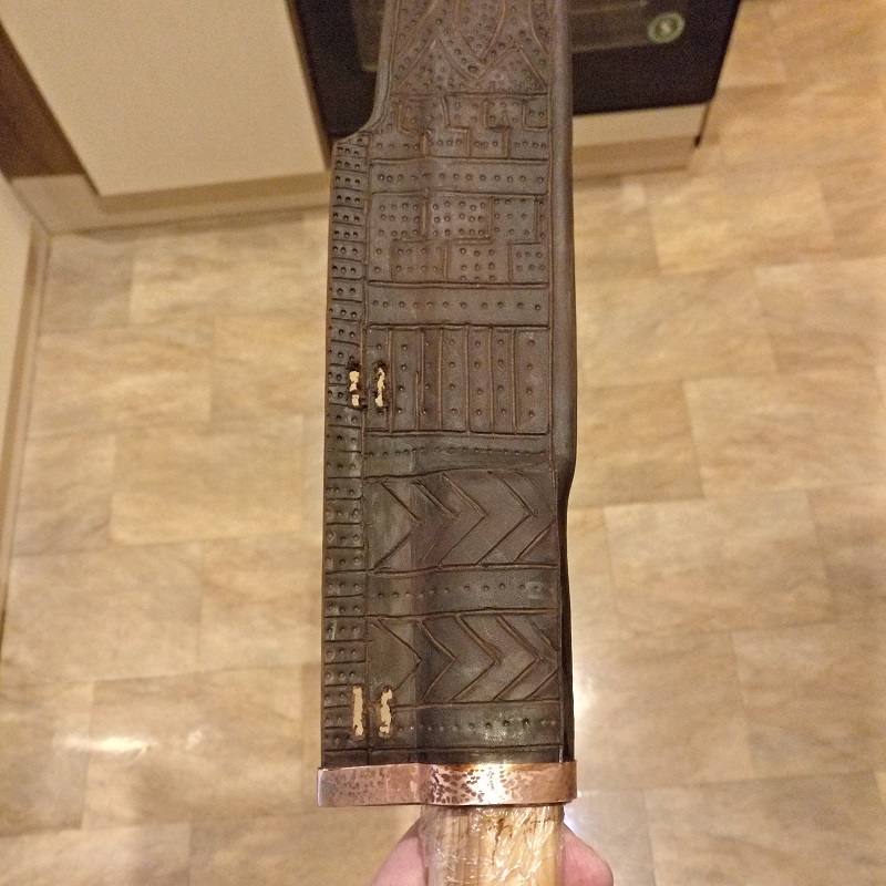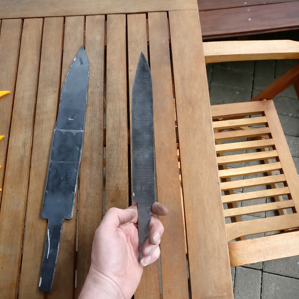 Wieder ein altes Sägeblatt benutzt und ähnliche Bauweise der Saxscheide aus natürlich gegerbtem Leder mit 3mm Stärke.