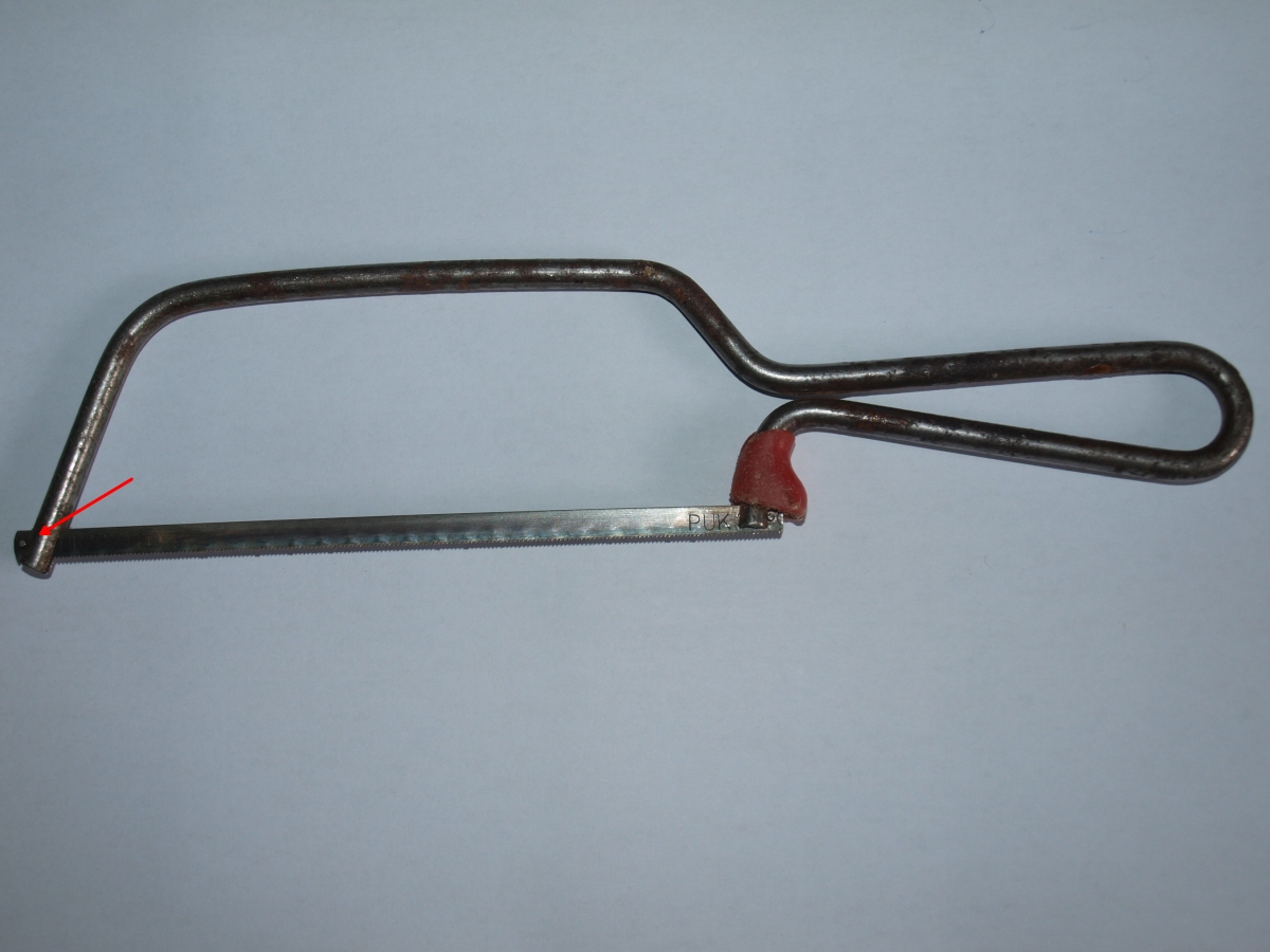 Hier die Haushaltssäge. Die Sägeblätter kann man einzeln kaufen mit unterschiedlicher Zahnung. Meist ist das Metallsägeblatt am besten geeignet. Aufnahmedorn (Pfeil) eventuell weg schleifen zum Einschieben des Blattes.