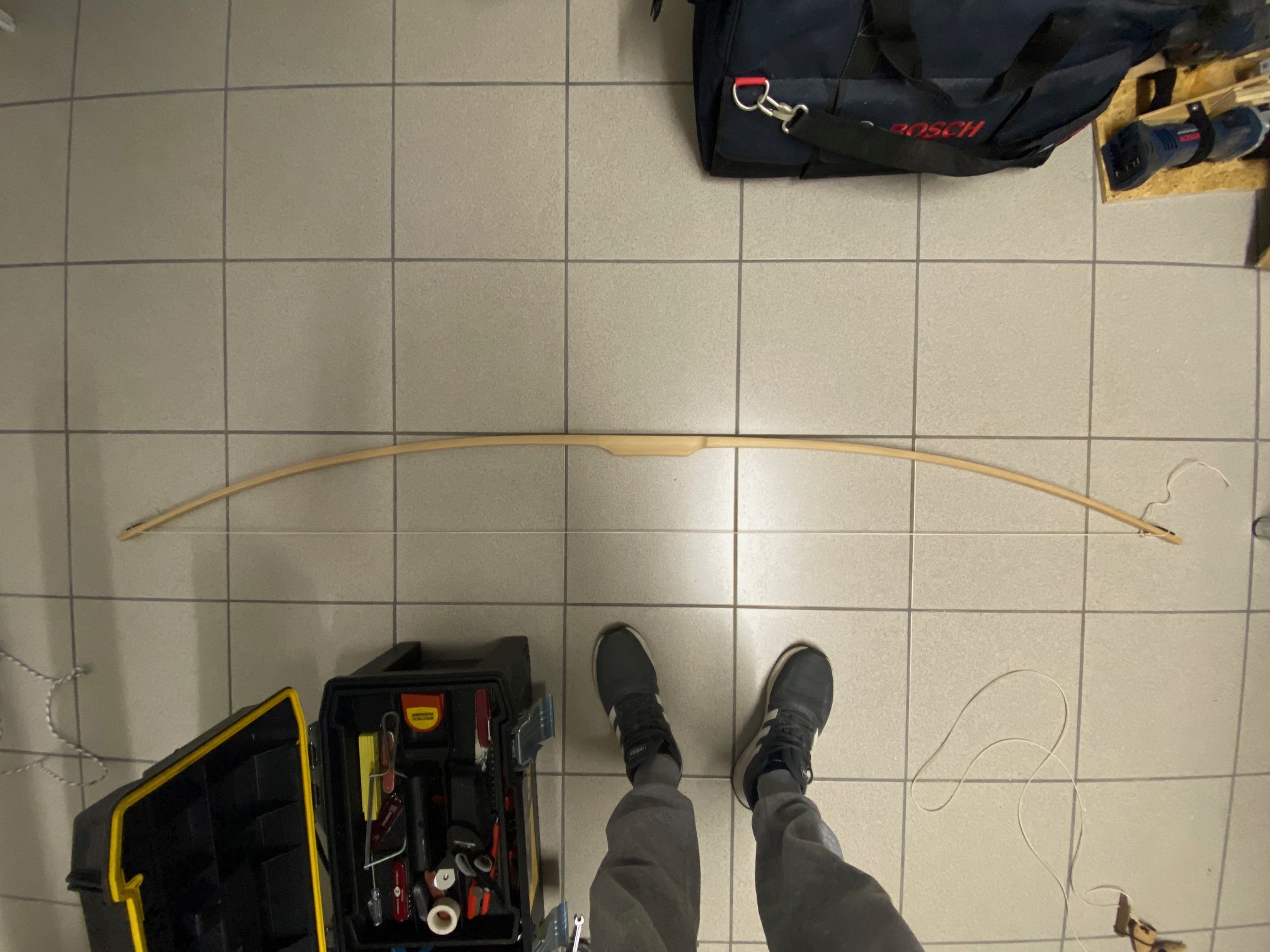 Ich konnte die Sehne nochmals verkürzen, Abstand von Sehne bis Griff beträgt aktuell 14.5 cm.