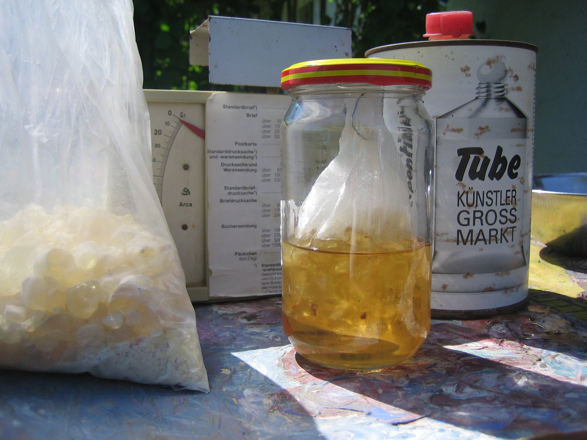 Wenn ich gesammeltes Harz verwende wird so auch der Rindenanteil und andere Partikel rausgefiltert, das scheint mir nach meinem Versuch doch wichtig zu sein um ein Eindringen zu fördern..