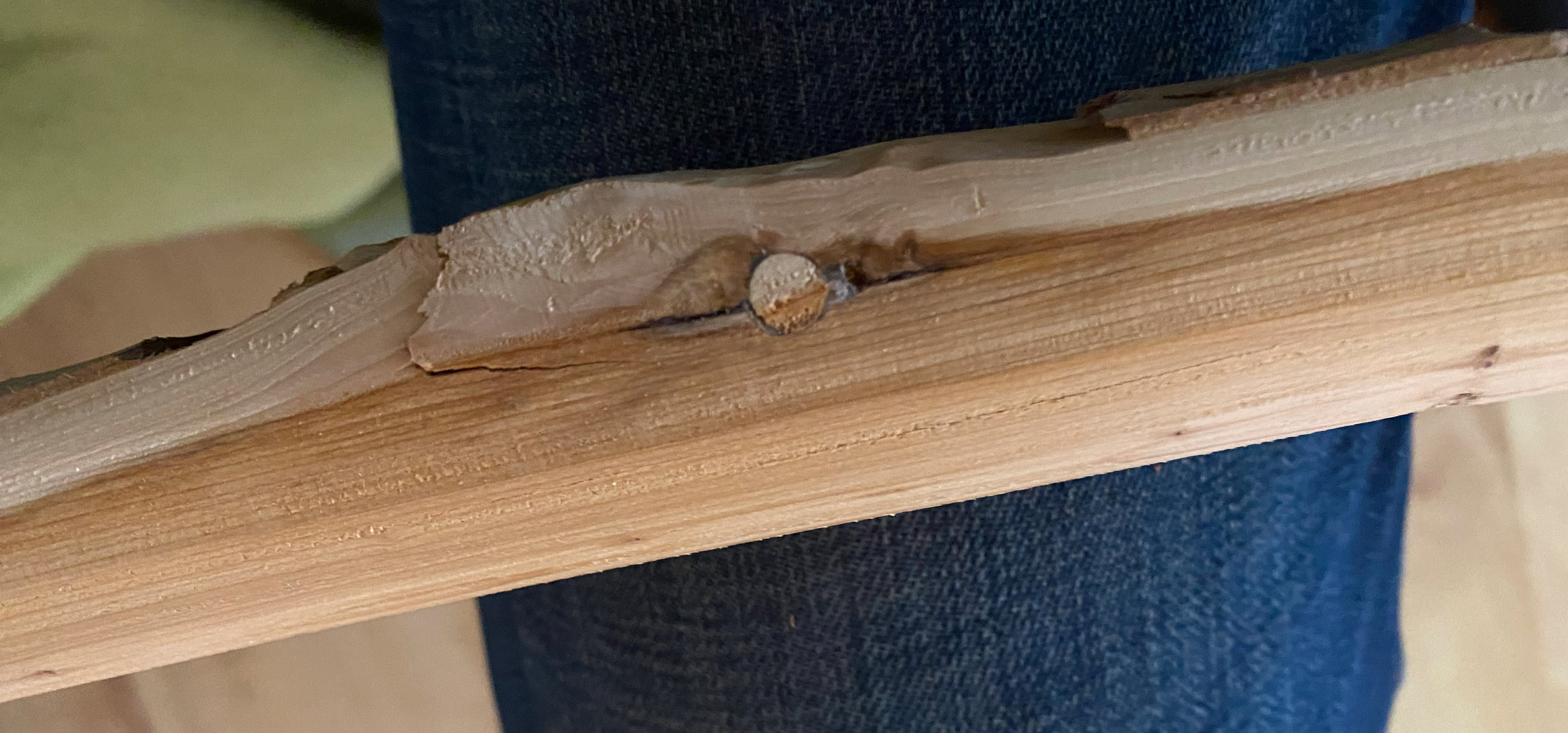Der Riss ist entstanden, weil da sie Fasern schief laufen, der Riss folgt der Faser.
