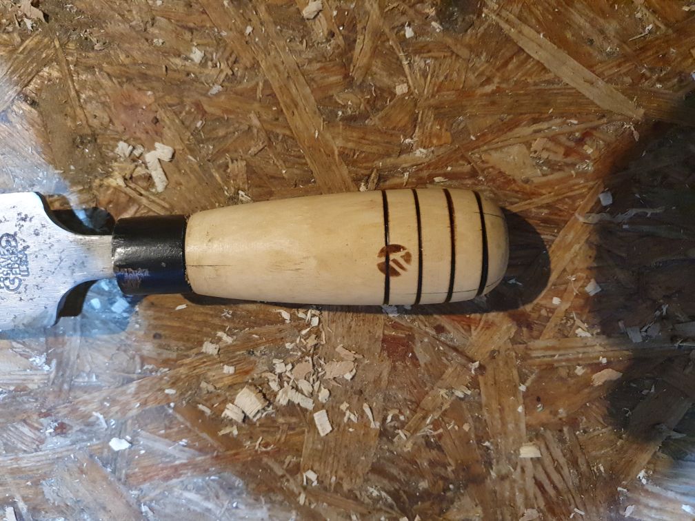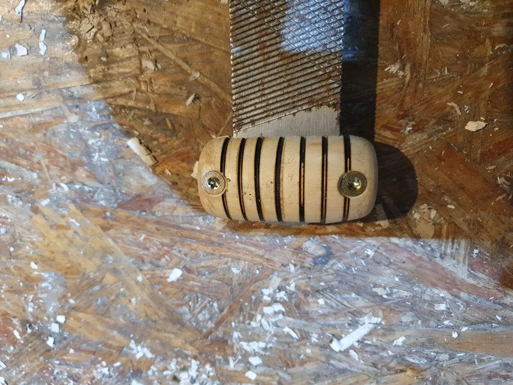 Ich hatte noch einen Griff von meinem Löffelschnitzbeitel übrig. Der hat noch ein paar Riffel gekriegt und damit ich mir nicht immer die linke Hand aufrasple hab ich für noch was fuer vorn gedrechselt