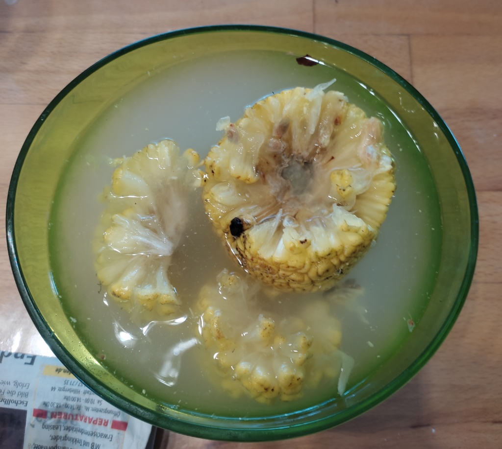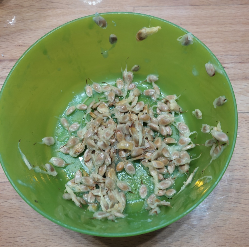 Ich konnte ca 150 bis 200 Samen aus der Frucht herauslösen und bekam noch mal ca 50 geschenkt. Diese sind jetzt alle in Töpfen und anzuchtbehältern eingesetzt. Es sind ziemlich viele Samen pro Fläche, weil ich einfach so viel Platz gar nicht hatte.