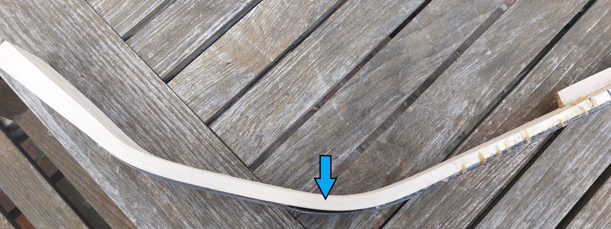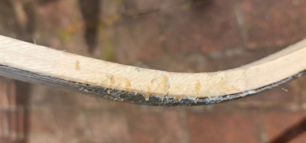 Die "Blase" ist knapp nach dem Kasan-Auge, also in einem Bereich, der eh steif bleiben sollte. Die Verleimung war mit Hautleim, den ich hab ihn in dem Bereich schon wieder rausgewaschen. Die nicht verleimte Stelle ist ca 1 cm tief, die Breite des Bogens ist 4,5 cm.