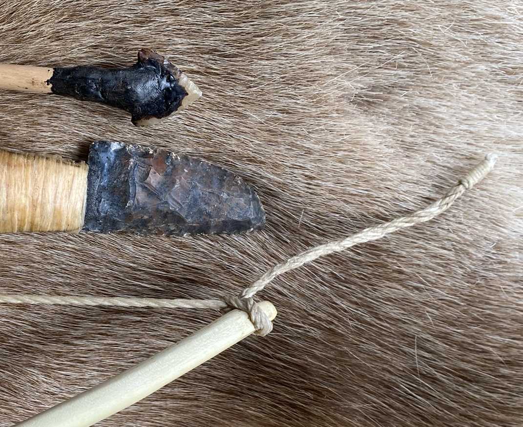 Pfeil: Wolliger Schneeball, Dreiecks-Feuersteinspitze, selbstgekochtes Birkenpech, Brennesselschnur, Rothirschsehne und (oh Schande) Truthahnfedern :o .