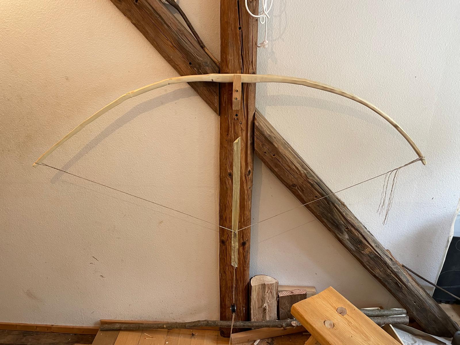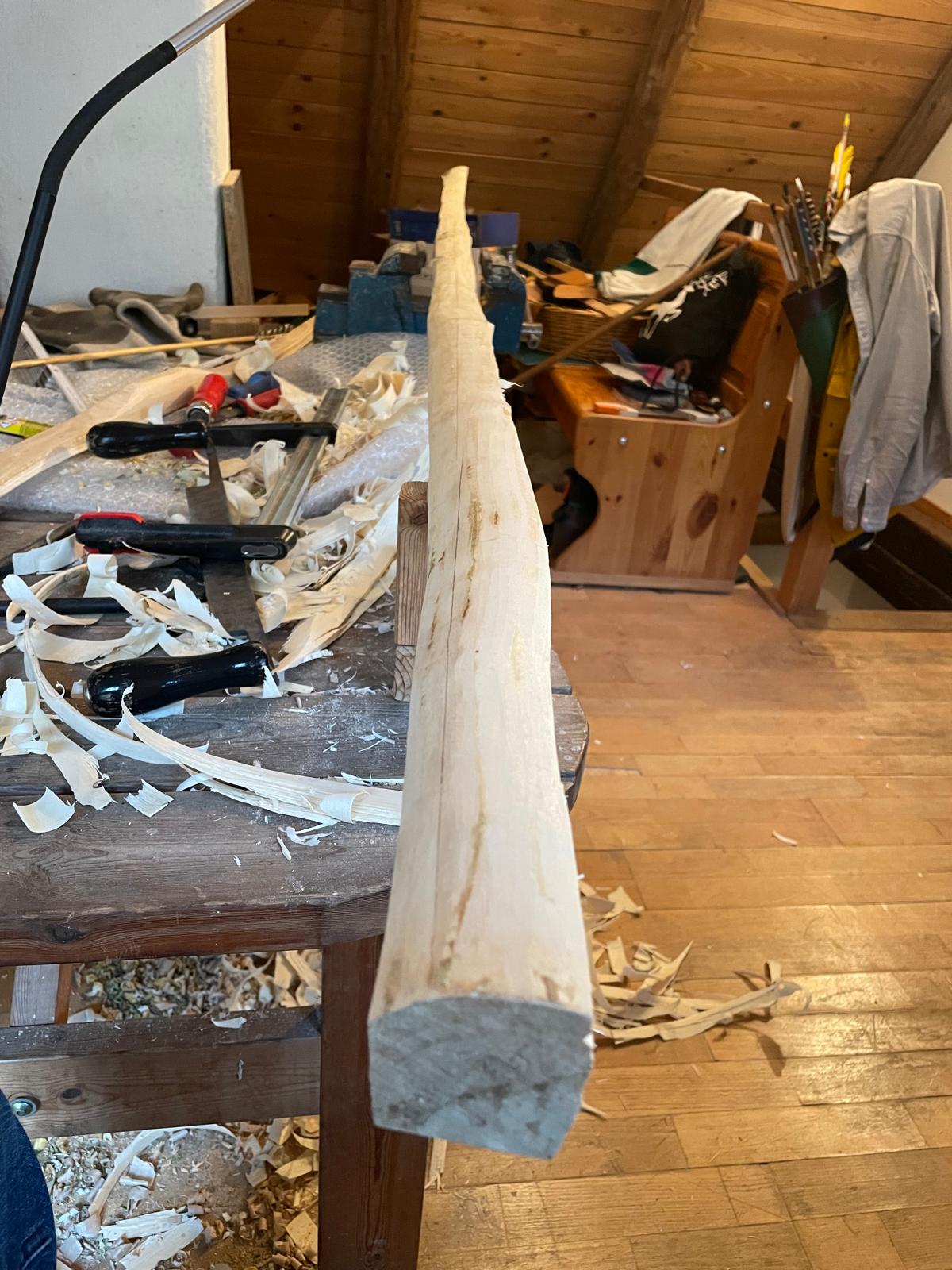 Anfangs im kalten Keller trocknen. Wenn man schnell auf Stave-Abmessungen kommt, hat man viel der Spannung aus dem Holz genommen und das Reißen wird minimiert. Nach der Arbeit den Stave auf einer Bohle fixieren, eventuell mit Unterlagen an den Enden für einen Reflex.