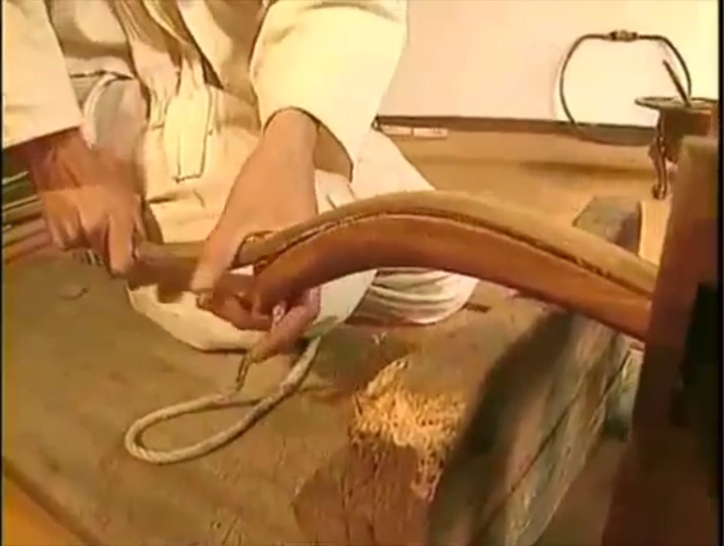 Der Rücken wird nun fertig ausgeformt. Im Video schlecht zu erkennen ist der genaue dickenverlauf und die Formgebung im Bereich des Siyahs. Hier wurde eigentlich der ganze Rücken Ellipsenförmig ausgearbeitet. Nur der Bereich des Siyahs nach dem stark reflexen Knick ist noch in Rohzustand. Danach werden die Enden mit Hilfe eines Holzplättchens zusammengebunden. Anschließend wird der Rücken mit Schwimmblasenleim grundiert. Besonders interessant finde ich es, wie die Sehnen für den Belag vorbereitet werden.