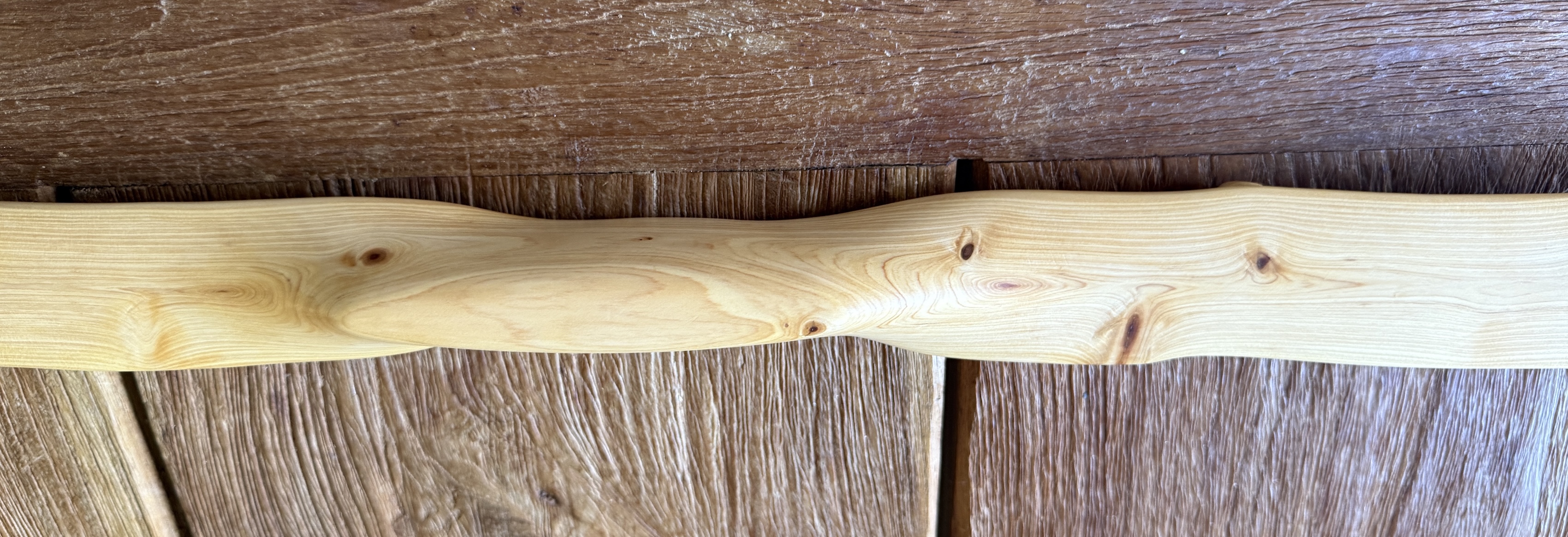 Die Rohlinge sind alle Seitenäste. Ein Foto von einem Teil des Stamms hänge ich mal an. Da die Seitenäste alle auf der Oberseite wiederum Äste hatten, habe ich die „astfreie“ Unterseite als Rücken genommen. Nachdem ich auf den Markkanal runtergearbeitet habe, hat sich das Holz schon vor dem Bodentiller von schnurgerade auf ordentlich Deflex verzogen. Ich tippe darauf, dass das Druckholz der Unterseite dafür verantwortlich ist. Trotzdem hat der Bogen auf Standhöhe noch eine gute Spannung. Ich hoffe er gefällt. Ein Foto vom Auszug folgt noch wenn ich Jemanden finde der mir bei der Aufnahme hilft. Ich überlege ob ich mal Flightpfeile baue und den Bogen damit ausprobiere. Ich habe jetzt den Tip bekommen, dass es Juniperus scopulorum (Rocky Mountain Wacholder) sei.