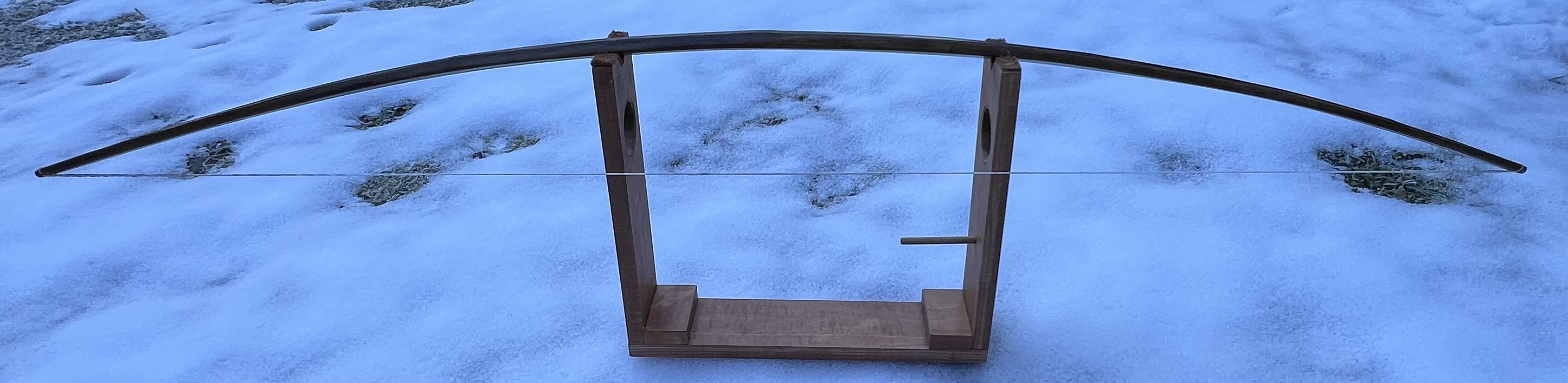 In der Werkstatt stehen bei mir alle möglichen Holzäste herum. Irgendwann geerntet, nix draus gemacht. Ein Hartriegelast, schon halbiert und entrindet, ist aufgrund seines verdrehten Endes ständig umgefallen und ich bin mehrmals darüber gestolpert. Jetzt hat es mir gereicht und ich habe das krumme Ende weggeschnitten und einen Bogen daraus gebaut. Das hat er jetzt davon!
