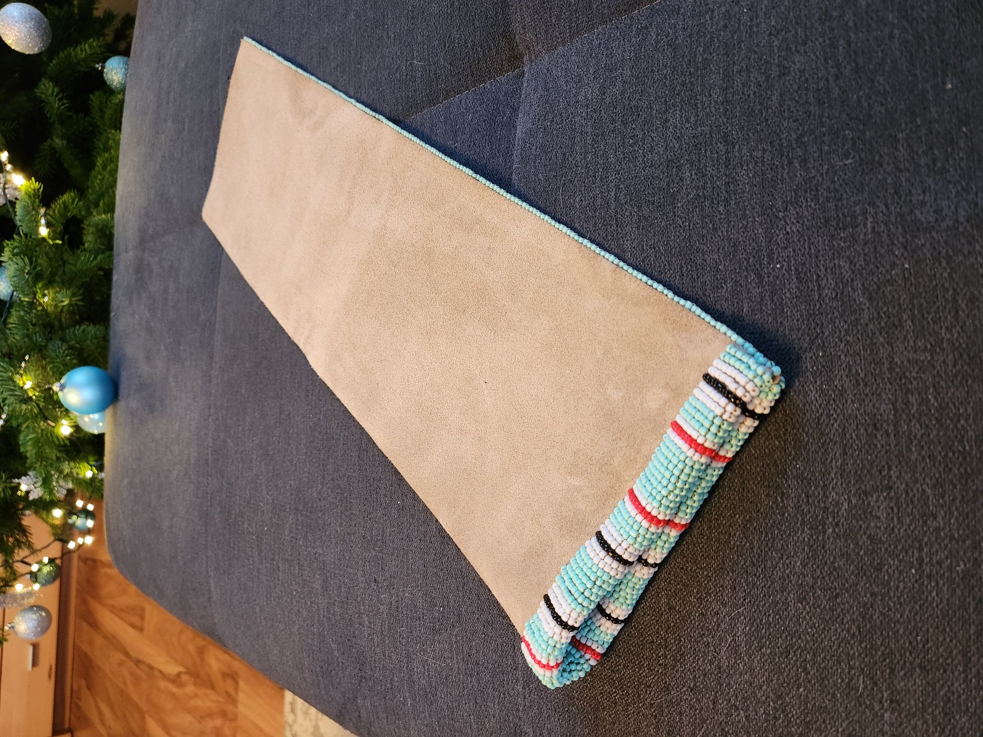 Der Köcher färbt jetzt nicht mehr ab und ich hab begonnen die Riemchen am Köcher zu befestigen. Zuerst mit Kleber auf Position fixiert, dann hab ich die weiße Perlenreihe befestigt, aber gleich alle am Stück ohne zwischenstiche. Wäre mir zu schwierig da beim durchstechen die richtige Position zu treffen. Deshalb hab ich dann für besseren halt unter der blauen Perlenreihe hin und her gestochen. Somit sieht man die Naht nicht.