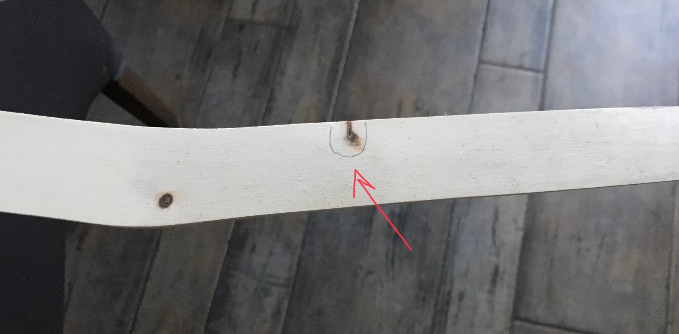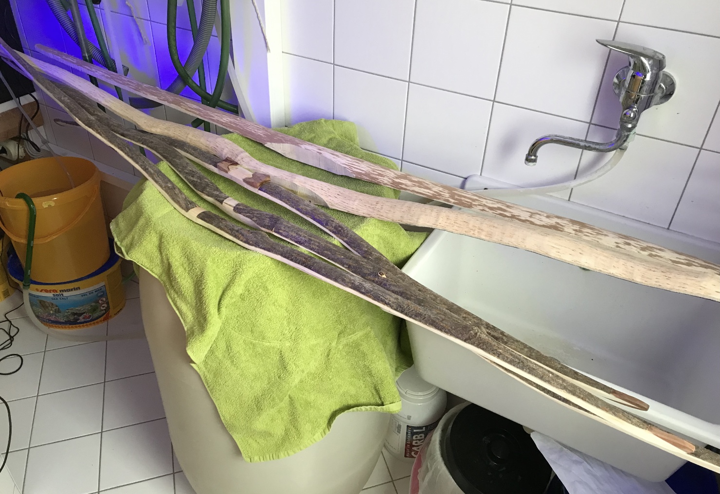 Habe noch ein paar Äste im Randbereich der Bogenbäuche ausgefeilt. Mit Aceton gereinigt, dann dünn mit Uhu endfest 300 ausgestrichen. Den Rest des Klebers mit Sägemehl vermischt und die Löcher aufgefüllt. An der Seite habe ich einen Klebestreifen geklebt, damit nichts ausläuft. Mit dem Fön meiner Frau (Sie war Skifahren) habe ich noch Lufteinschlüsse im Epoxy Gemisch ausgetrieben. Nach 24 Stunden dann grob verschliffen. Die Kirschrinde habe ich auch noch seitlich abgeschliffen. Beim Doppelbogen habe ich den unteren deflexen Bogen mit der HLP getempert. Der untere Bogen wäre im Prinzip trocken, der obere nicht getemperte verliert immer noch minimal Gewicht. Am Montag werde ich vorsichtig mit dem Tillern beginnen.