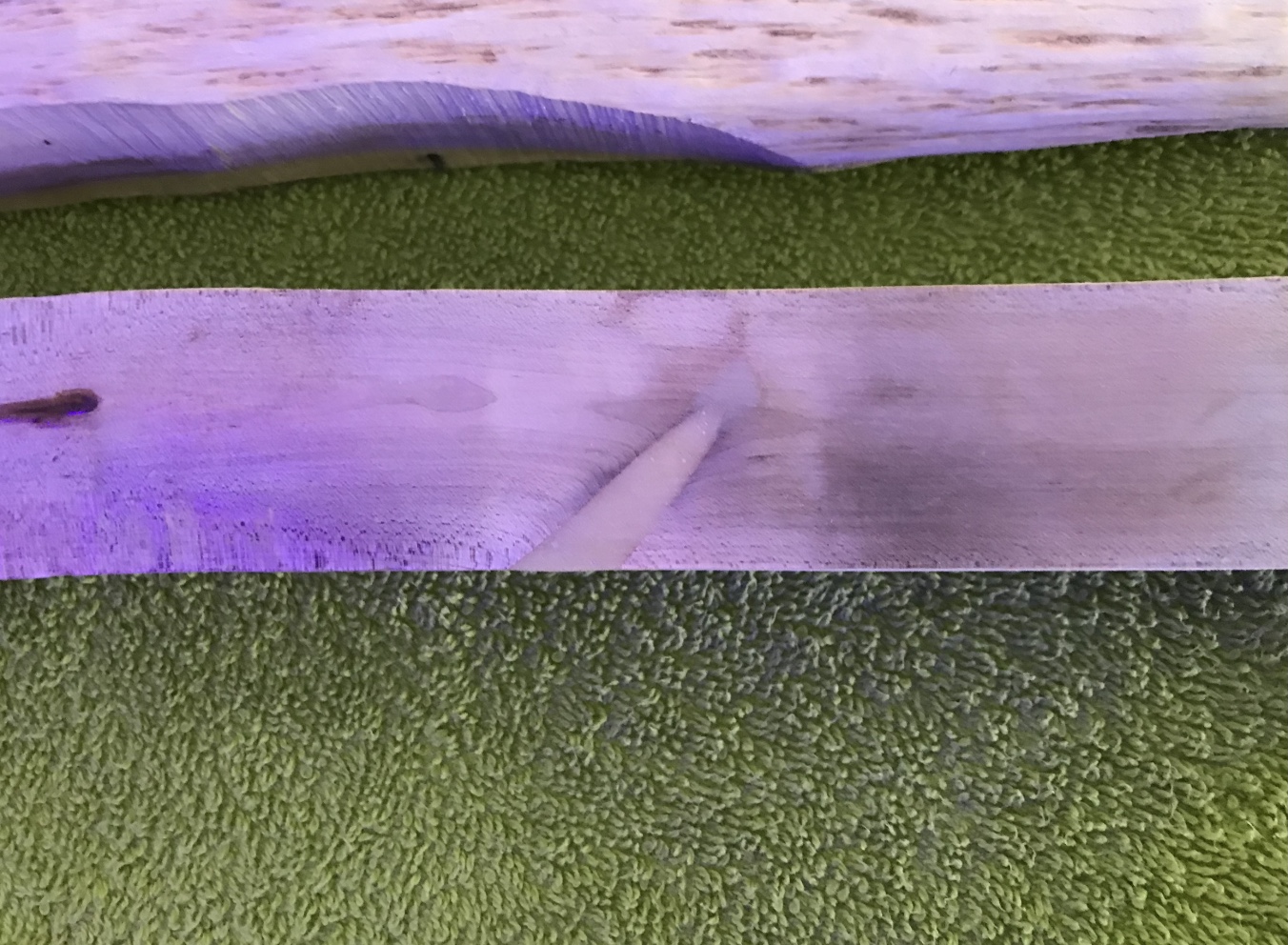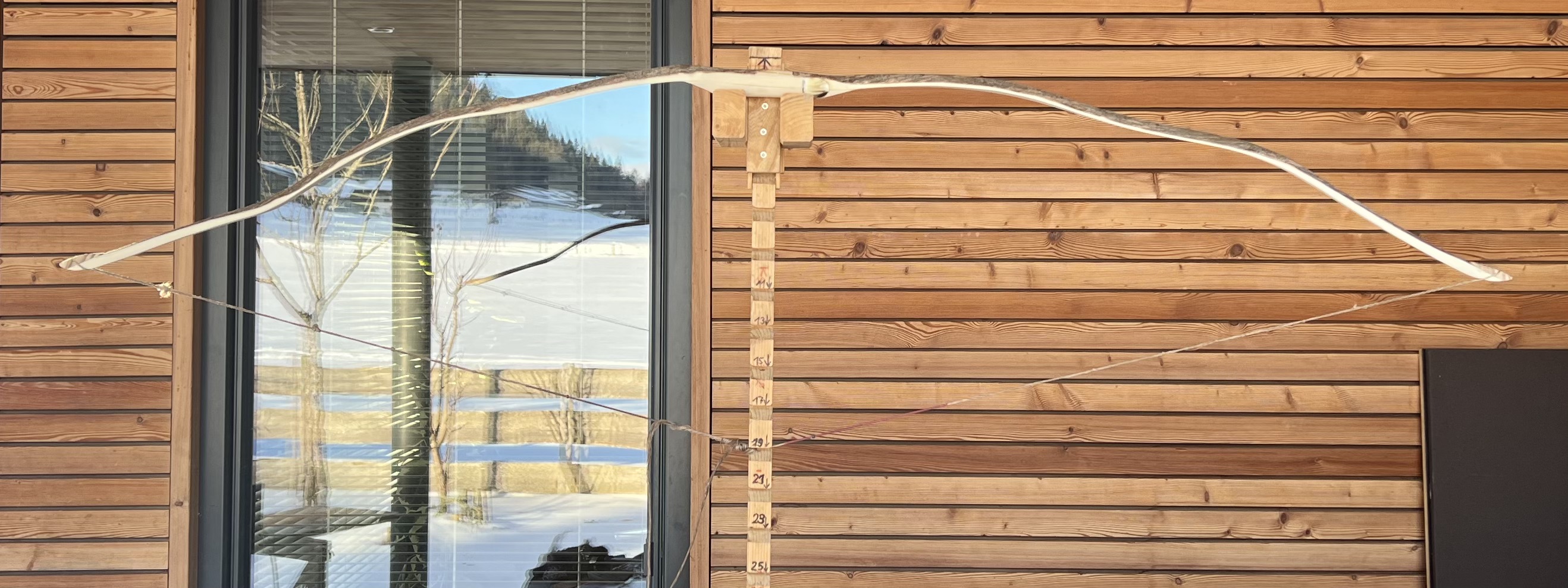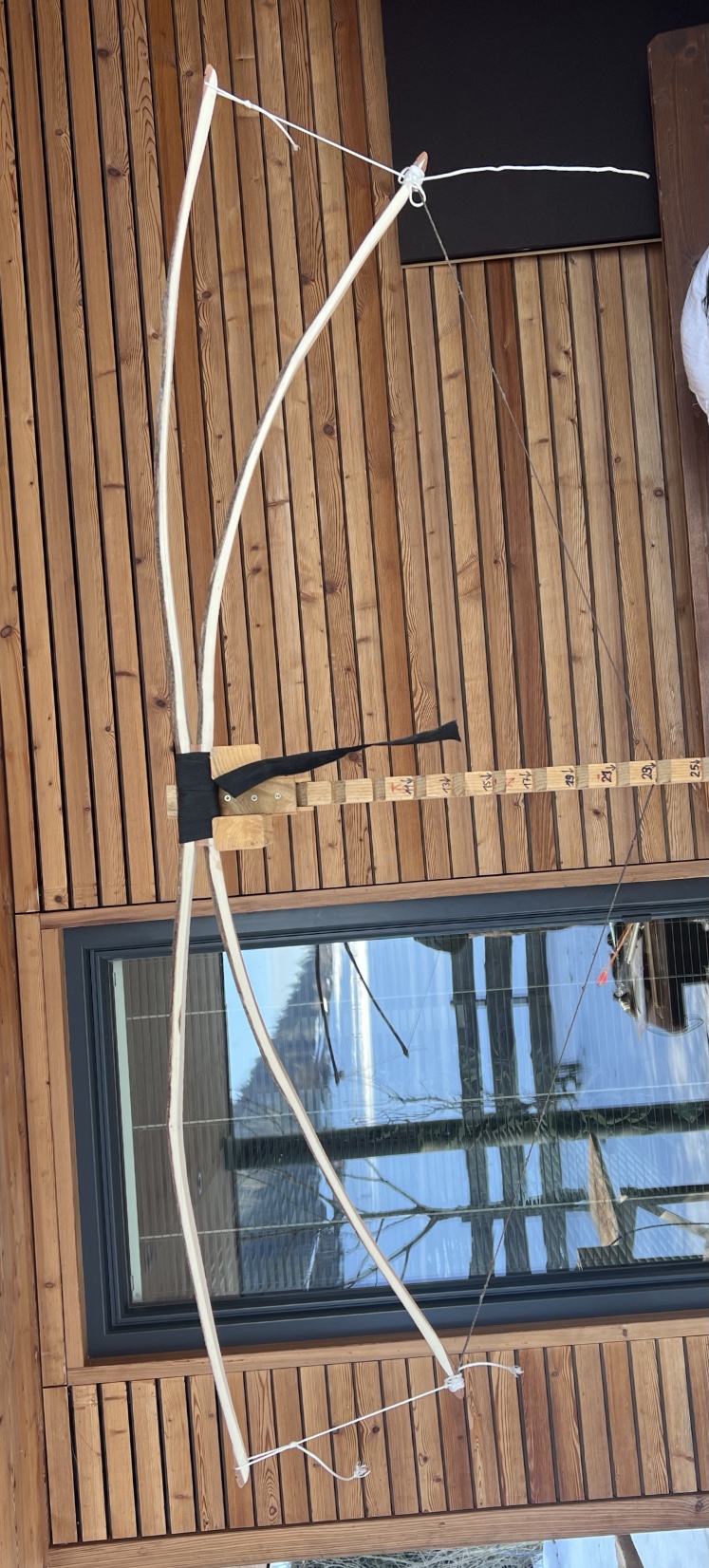 Der Plan: die beiden Bögen des Doppelbogen werden getrennt getillert und dann erst im Griffbereich mit Epoxy zusammen geklebt. Dann verschmälere ich den Griffbereich und werde mit Sternzwirn wickeln, zuletzt alles mit Epoxy tränken. Der Vorteil des langen vorderen Bogens ist meiner Meinung nach der immer fast rechte Winkel der Verbindungssehne. Beim Penobscot Bogen ist der Sehnenwinkel der Verbindungssehne weit über 90 Grad und der Winkel nimmt im Auszug noch zu. Es stärkt eigentlich nur die Zugseite. Am Bauch verstärken sich aber dadurch die Druckkräfte. Bei den meisten Hölzern ist aber ohnehin der unter Druck gesetzte Bauch schwächer als der auf Zug belastete Rücken.