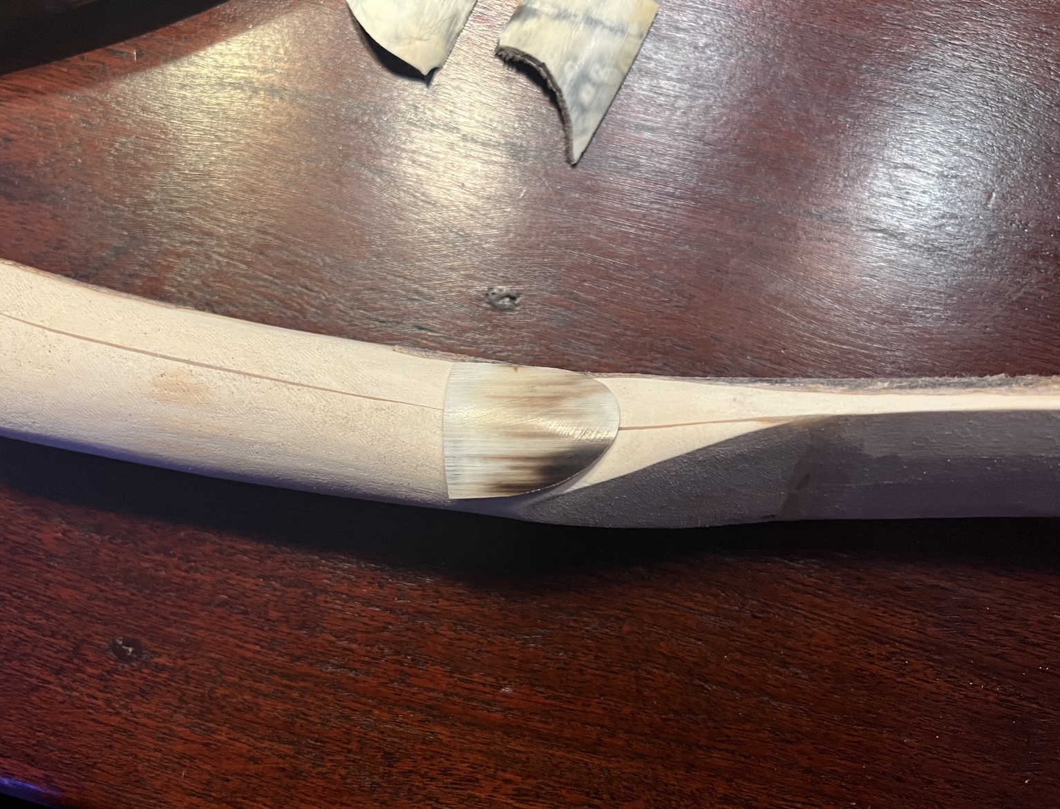 Zum Zeit totschlagen habe ich eine Pfeilanlage aus Kuhhorn vorbereitet. Aus dem Horn ein farblich passendes Stück mit der Bandsäge ausgeschnitten, dann mit der Halbrundfeile und Schleifpapier auf der Innenseite 1 mm dünn ausgeschliffen, dann ab ins Backrohr, weich backen bei 120 Grad und auf den Bogen fest mit Hosengummi gewickelt, draußen abkühlen lassen. Aufkleben mit Hautleim und wieder mit Hosengummi gewickelt. Wieder Warten……..