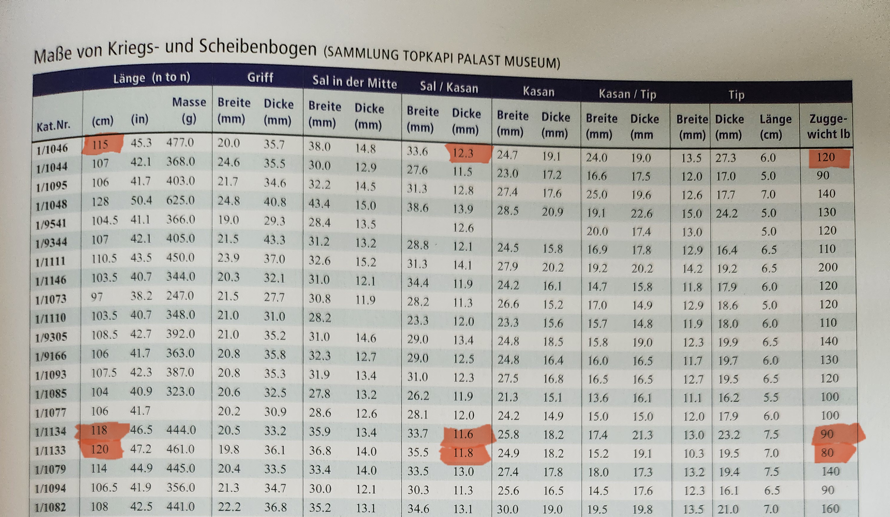 Bei den aller meisten Bögen die in diesem Buch angegeben sind, ist dieser Bereich wesentlich dicker. Ich vergleiche aber nochmals die Werte mit den zwei Osmanen, die bei mir zu Hause sind.