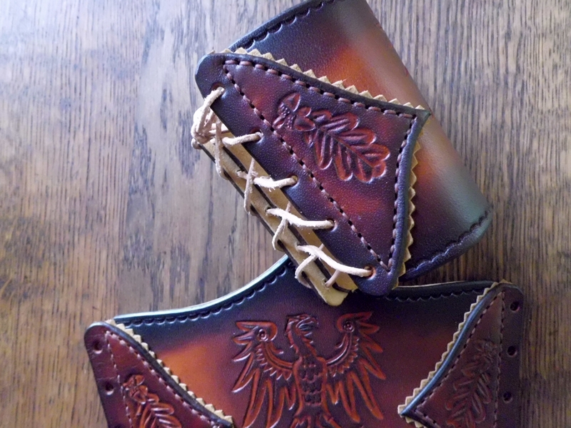 Ich habe ein Paar Armstulpen zum Thema beizusteuern. Die Armstulpen wurden für den Mittelaltermarkt auf Burg Stargard angefertigt. Der Adler ist das Wappentier der Askanier die das Burgfest ausrichten.