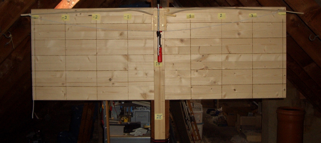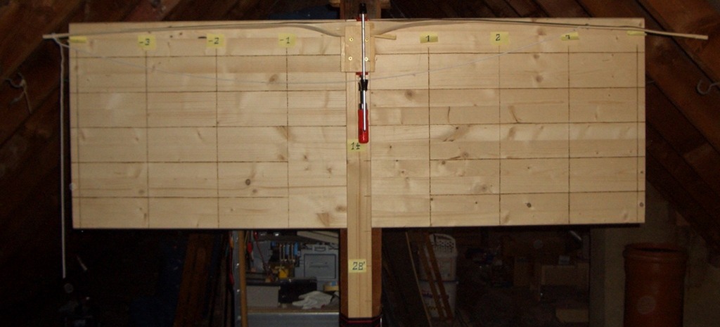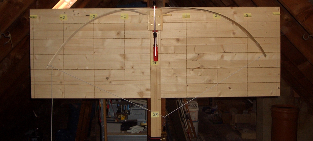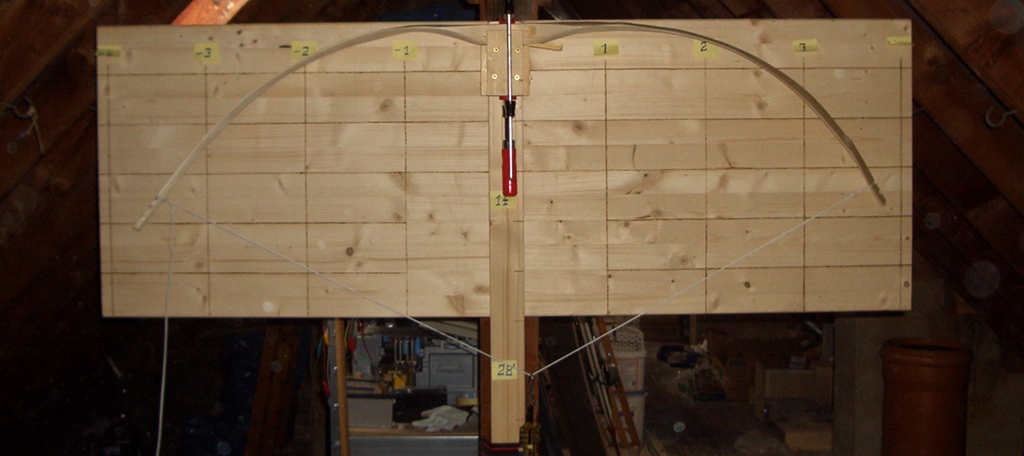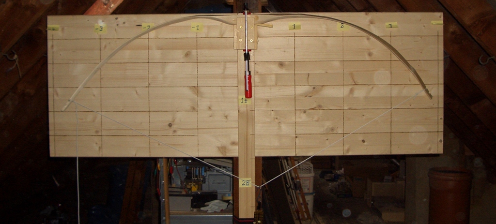 Inzwischen muss ich auch die Standhöhe etwas über das normale Maß vergrößern, damit der Sehnenwinkel nicht über 90° liegt. Der Bogen ist jetzt nur noch etwa 1,65m von Nock zu Nock lang.