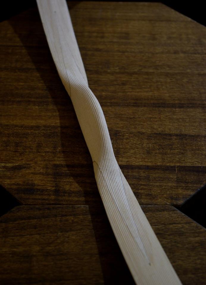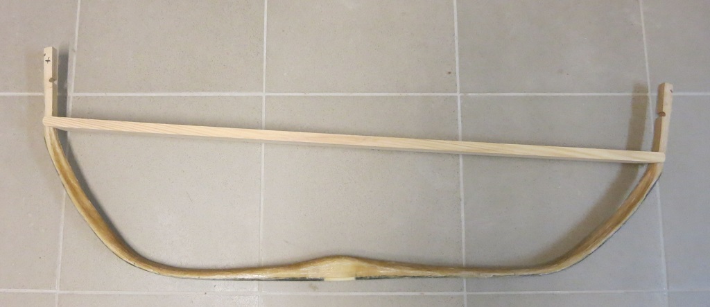 Den anderen Bogen, den ich mit Tendschek verleimt hatte, habe ich auch schon auf das Spannbrett geschnallt. Der war leicht ungleich und ich habe ihn mit der HLP sanft erhitzt. Erst ist gar nichts passiert, aber dann hat der warme Arm mächtig nachgegeben.