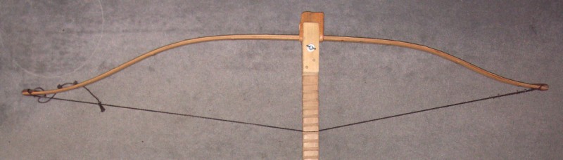Der Bogen zieht allerdings oben und unten nach links. Was für mich ja ein korrektes Iriki ergeben würde. Allerding erschien mir das vor allem an den Wurfarmenden etwas zu heftig zu sein, so habe ich die Spannschnur rechtsseitig in die Nocks einghängt und zusätzlich im unteren Deflex ein Korrekturholz eingehängt. So steht er nun und zieht sich nun nach rechts hinüber. So lasse ich ihn nun ein paar Tage stehen und gucke gelegentlich mal nach was er macht.