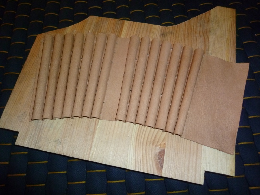 Wenn es traditionell sein soll kannst du das Leder mit Bienenwachs härten. Das ist dann Wasserdicht. Nur dazu müsstest du es wohl nochmal runtermachen und dann nach und nach einwachsen und wieder annageln.