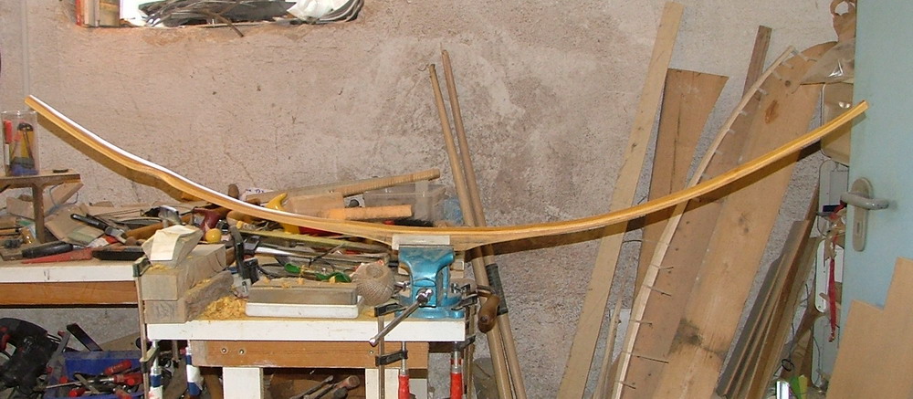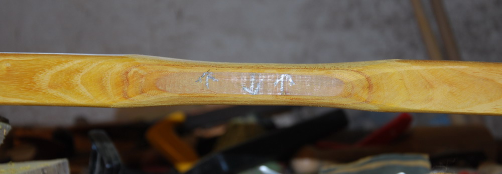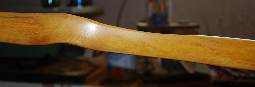 Es war reichlich schwierig ein exaktes Gleichgewicht der Wurfarme herzustellen, schon Abweichungen die bei einem geraden Stave gerade mal messbare Untschiede in dem Sehnenabstand oberhalb und unterhalb des Griffs ergeben, führen hier zu deutlich sichtbarer Asymetrie.