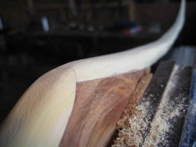 Ich würde es mit tempern (HLP) versuchen, kürzen überlastet das Holz an den Fades oder du bekommst viel Set. Mit Recurves reinbringen passiert dasselbe, da hats einfache einwenigzuwenig Holz an den Fades. Das Design sieht toll aus!