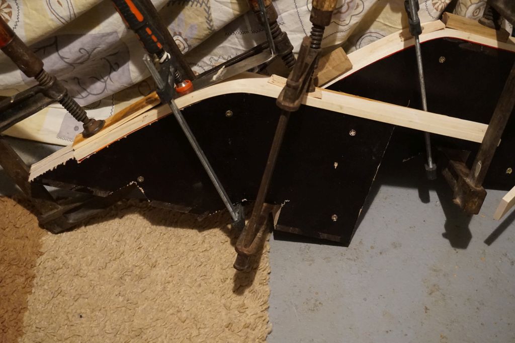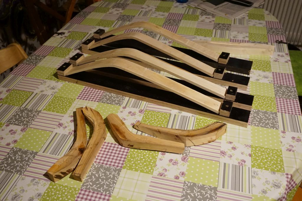 Die Rahmen sind gebogen und aus der Form heraus. Sie müssen aber zum trocknen zwangsweise auf ein Kantholz
