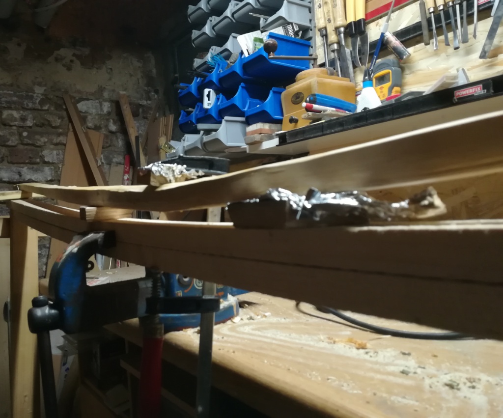 Den Rohling aus dem gerissen Save (lag jetzt 2Tage im Warmen ca 21°) hab ich noch minimal bearbeitet und mir vorsichtig schon mal die Wurfarme im Bodentiller angeschaut. Trotz Freihand einfach nach Gefühl taping sahen die schon ganz gut aus. Griff habe ich aber immer noch nicht ausgearbeitet