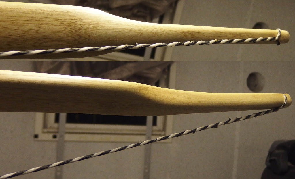 ich hätte auch noch die Möglichkeit, den Griff zu versteifen neben den anderen Ratschlägen, aber bevor ich irgendwas sonst unternehme, habe ich zuerst den rechten Wurfarm noch etwas an den linken angeglichen. Der rechte Arm (der mit dem Astloch) ist 0,5cm länger als der linke. Er lag also schon fast mittig auf dem Tillerbaum. Wobei der Pfeil bzw. der Druckpunkt ja nicht in der Mitte liegt.