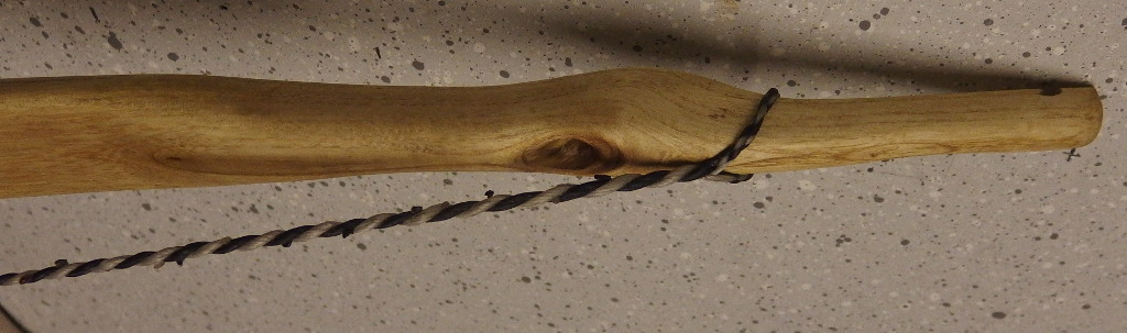 Ich hatte den ursprünglich 190cm langen Rohling mit einem dicken Ast bei 166cm Länge. Da ich den Bogen nicht so stark kürzen wollte, beschloß ich, den Ast im Bogen zu belassen. Eine Biegung an der Stelle erschien mir sehr gewagt, zumal ich noch nie probiert habe, eine so große Aststelle biegen zu lassen.