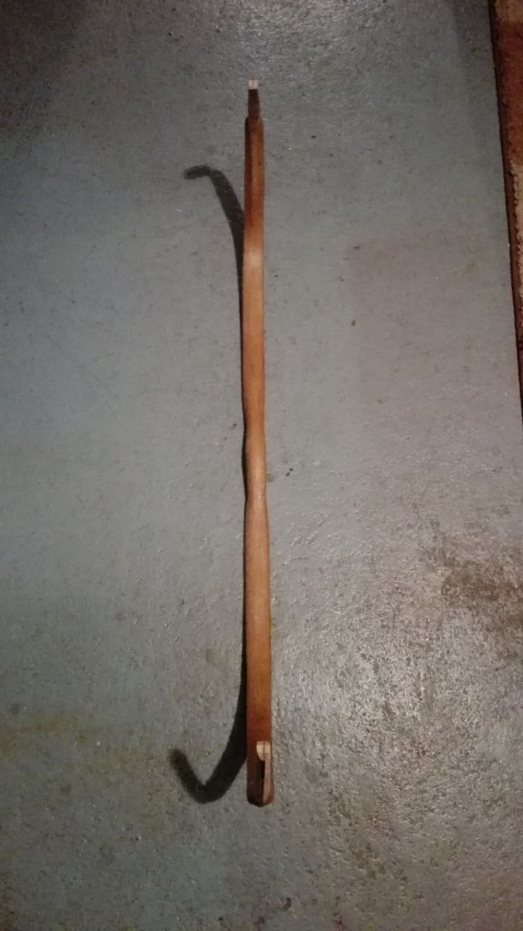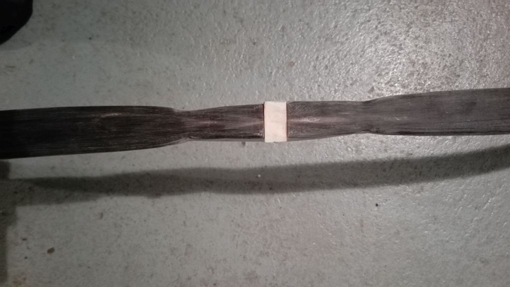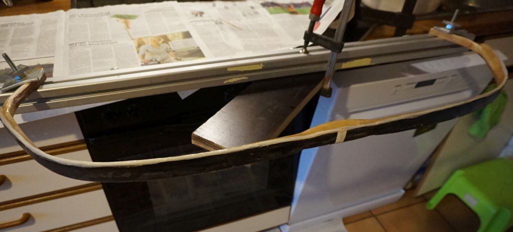 Die Tage wurde die Sehnenschicht mit einem 180er Schleifpapier angeschliffen und mit 10%tigem Hautleim 2x grundiert. Danach kam die nächste Sehnenschicht drauf. Die Wurfarme wurden nach dem geelieren um weiter 10 cm zusammen geschoben und dann wurde wieder mit Hosengummis umwickelt. Ich wollte ja mehr Bilder liefern vom Sehnen aufbringen... die waren alle entweder zu dunkel oder völlig überbelichtet Ein paar kann ich aber zeigen.