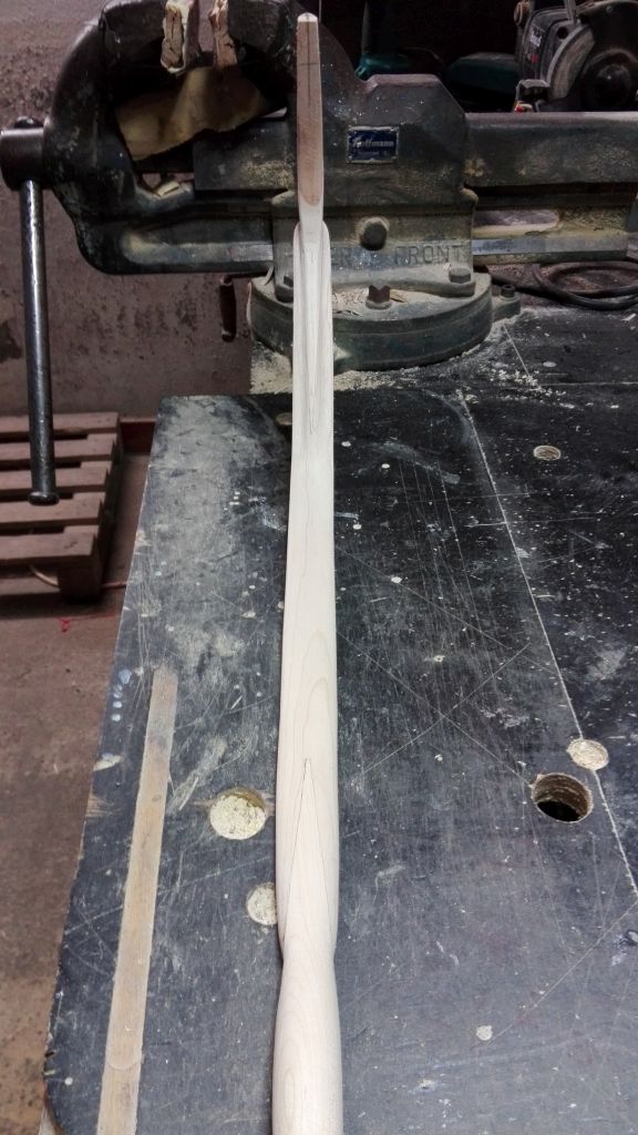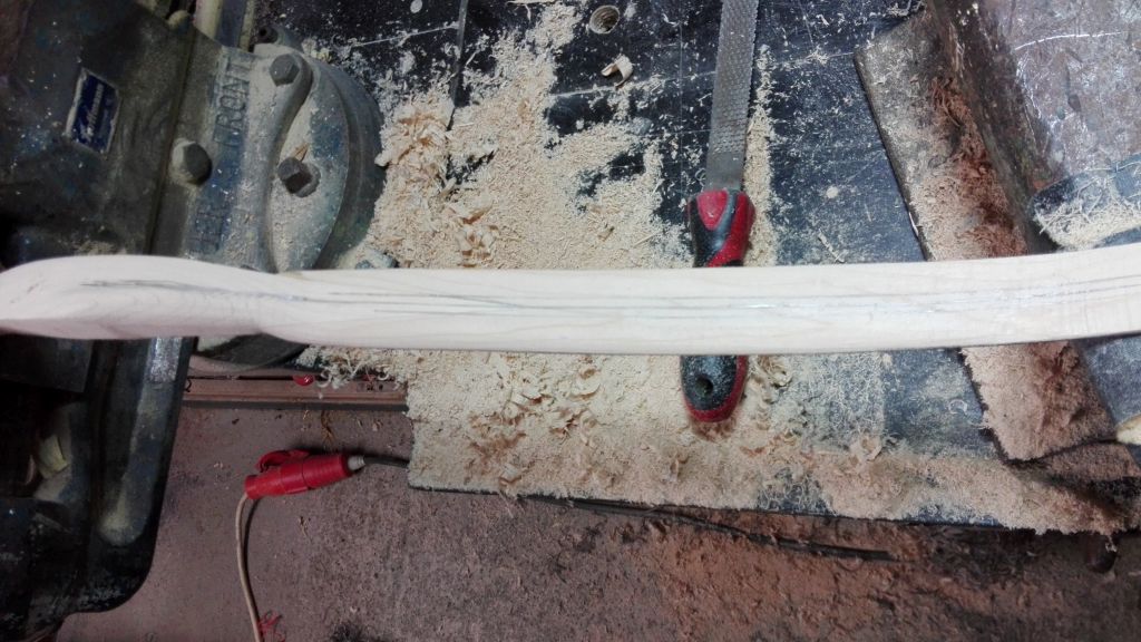 Nun habe ich das Ahorn auf die entgültige Dicke gebracht und durch leichtes biegen steife Stellen gleich beseitigt. Danach wurde auf dem Ahorn nochmals die Mittellinie aufgezeichnet und rechts/links von der Mitte nochmals eine Linie mit dem Abstand von 3mm zur Mittellinie eingezeichnet. Rundum wurde vom Horn auch eine Linie von 3mm auf das Ahorn gezeichnet. Nun wurde zuerst der Kasan ausgearbeitet, sowie die Tips grob auf Maß gebracht. Anschließend werden die Kanten zu den Linien auf dem Rücken und der Seite gebrochen und leicht verundet. Jetzt wird wieder die Flucht kontrolliert und verdrehungen der Tips direkt beseitigt.( Je genauer man vorher arbeitet, um so weniger muss man nachher richten). Mein Kunde war auch da und den Griff getestet, ob er gut in der Hand liegt. Da alles o.k. war kann nun die erste Lage Sehne aufgebracht werden. Ich hoffe nur, dass ich das gewünschte Zuggewicht treffe...